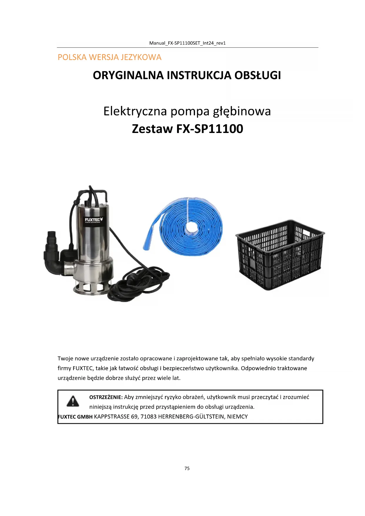 Twoje nowe urządzenie zostało opracowane i zaprojektowane tak, aby spełniało wysokie standardy firmy FUXTEC, takie jak łatwość obsługi i bezpieczeństwo użytkownika. Odpowiednio traktowane urządzenie będzie dobrze służyć przez wiele lat. OSTRZEŻENIE: Aby zmniejszyć ryzyko obrażeń, użytkownik musi przeczytać i zrozumieć niniejszą instrukcję przed przystąpieniem do obsługi urządzenia. FUXTEC GMBH KAPPSTRASSE 69, 71083 HERRENBERG-GÜLTSTEIN, NIEMCYManual_FX-SP11100SET_Int24_rev1