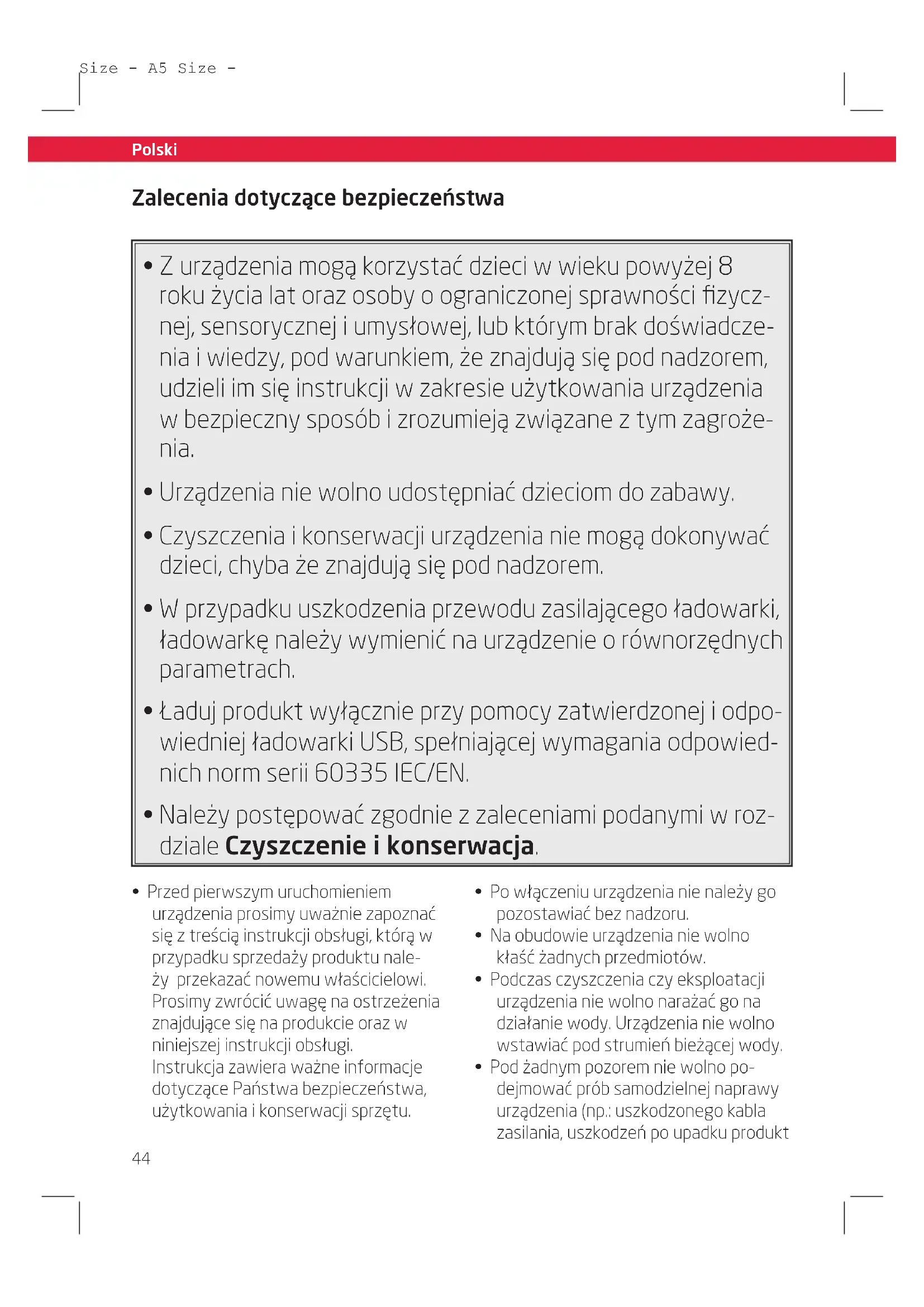 - Pod żadnym pozorem nie wolno po- dejmować prób samodzielnej naprawy urządzenia (np.: uszkodzonego kabla zasilania, uszkodzeń po upadku produkt45 Polski Size - A5