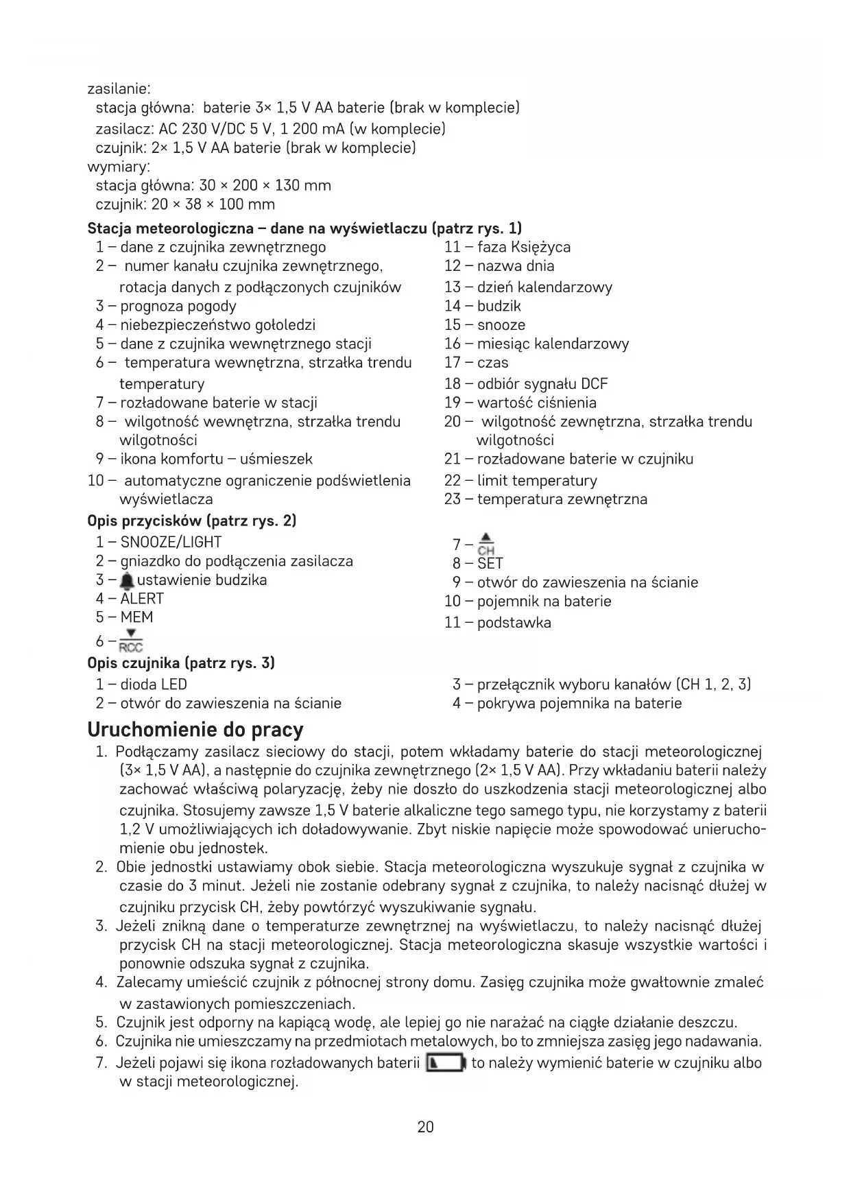 1 – nów 2 – półksiężyc rosnący 3 – półksiężyc rosnący 4 – pierwsza kwadra 5 – półksiężyc garbaty rosnący 6 – półksiężyc garbaty rosnący 7 – pełnia 8 – półksiężyc garbaty malejący 9 – półksiężyc garbaty malejący 10 – trzecia kwadra 11 – półksiężyc malejący 12 – półksiężyc malejący Wyświetlanie maksymalnych i minimalnych zmierzonych wartości temperatury iciśnienia Naciskając kolejno przycisk MEM wyświetlamy maksymalne i minimalne wartości zmierzone tem- peratury i wilgotności. Przytrzymanie wciśniętego przycisku MEM w trybie wyświetlania MAX/MIN kasuje z pamięci wartości zmierzone. Pamięć wartości zmierzonych kasuje się automatycznie każdego dnia o godz. 00:00. Ustawianie budzika Naciskamy długo przycisk , wyświetli się ALM i zacznie migać ustawienie czasu budzika. Wartości czasu ustawiamy kolejno naciskając przyciski / , dla potwierdzenia i przejścia dalej w menu naciskamy przycisk . Aktywację budzika wykonujemy kolejno naciskając przycisk . Budzik aktywny – wyświetlona ikona . Budzik nieaktywny – ikona nie będzie wyświetlana.23 Funkcja powtórnego budzenia (SNOOZE) Dzwonienie budzika przesuwamy o 5 minut przyciskiem SNOOZE/LIGHT umieszczonym w górnej części stacji meteorologicznej. Naciskamy go, kiedy tylko dzwonienie rozpocznie się. Ikona będzie migać. Żeby skasować funkcję SNOOZE, naciskamy jakikolwiek inny przycisk – ikona nie będzie wyświetlana. Budzik włączy się ponownie następnego dnia. Jeżeli w czasie dzwonienia nie naciśniemy żadnego przycisku, dzwonienie zakończy się automa- tycznie po 2 minutach. Podświetlenie wyświetlacza w stacji Przy zasilaniu z zasilacza: Automatycznie zostaje ustawione stałe podświetlenie wyświetlacza. Naciskając kolejno przycisk SNOOZE/LIGHT można ustawić 3 tryby podświetlenia (100 %, 50 %, wyłącz). Przy zasilaniu tylko z baterii 3× 1,5 V AA: Podświetlenie wyświetlacza jest wyłączone, po naciśnięciu przycisku SNOOZE/LIGHT wyświetlacz podświetli się na 10 sekund i następnie wyłączy się. Przy zasilaniu tylko z baterii nie można włączyć stałego podświetlenia wyświetlacza! Uwaga: włożone baterie służą do rezerwowania danych zmierzonych/ustawionych. Jeżeli baterie nie będą włożone i odłączymy zasilacz, to wszystkie dane zostaną skasowane. Automatyczne ograniczenie podświetlenia wyświetlacza Przy zasilaniu stacji z zasilacza można zaprogramować automatyczne ograniczenie jasności wy- świetlacza z 100 % do 50 %. Naciskamy dłużej przycisk SNOOZE/LIGHT, zacznie migać aktywacja funkcji . Naciskając kolejno przycisk / aktywujemy tę funkcję(ON) albo ją deaktywujemy (OFF). Wybór potwierdzamy przyciskiem SNOOZE/LIGHT, zacznie migać ustawienie czasu (rozdzielczość 1 godzina). Naciskając kolejno przycisk / ustawiamy godzinę aktywacji ograniczenia jasności, potwierdzamy SNOOZE/LIGHT. Naciskając kolejno przycisk / ustawiamy godzinę deaktywacji ograniczenia jasności, potwier- dzamy SNOOZE/LIGHT. W ustawionym czasie dojdzie do ograniczenia jasności wyświetlacza. Uwaga: Jeżeli wybierzemy aktywację (ON)/deaktywację (OFF), to po 20 sekundach dojdzie do automatycznego jej zapisania, o ile nie naciśniemy następnego przycisku. Ustawienie fabryczne ograniczenia jasności wyświetlacza jest od godz. 22:00 do 8:00. Jeżeli w czasie tego ustawionego czasu naciśniemy przycisk SNOOZE/LIGHT, to po 10 sekundach dojdzie do powrotu 50 % jasności wyświetlacza. Prognoza pogody Stacja prognozuje pogodę na podstawie zmian ciśnienia atmosferycznego na następne 12–24 godzin dla terenów odległych do 15–20 km. Wiarygodność prognozy pogody wynosi 70–75 %. Ikona prognozy pogody jest wyświetlana w polu nr 3. Ponieważ prognoza pogody nie może się sprawdzać w 100 %, to producent, ani sprzedawca nie może odpowiadać za jakiekolwiek straty wynikające z niedokładnej prognozy pogody. kiedy stacja meteorologiczna zacznie dobrze prognozować pogodę. Ikony prognozy pogody słonecznie lekkie zachmurzenie zachmurzenie deszcz śnieg24 Ikona śnieżynki będzie migać przy temperaturze zewnętrznej w granicach 0 °C do +2,9 °C. Ikona śnieżynki będzie stale wyświetlana przy temperaturze zewnętrznej poniżej 0 °C. Ikona komfortu – uśmieszek Ikona komfortu jest wyświetlana w polu nr 9. Jeżeli wilgotność jest pomiędzy 40–70 % RV, będzie wyświetlana ikona GOOD – środowisko komfortowe. Jeżeli wilgotność jest mniejsza od 40 % RV, pojawia się ikona DRY – środowisko suche. Jeżeli wilgotność wewnętrzna jest większa, niż 70 % RV, będzie wyświetlana ikona HUMID – środowisko wilgotne. Ustawianie limitów maksymalnej i minimalnej temperatury Limity temperatury można ustawiać niezależnie dla 3 czujników temperatury zewnętrznej. Naciskając kolejno przycisk CH, wybieramy wymagany numer czujnika, dla którego chcemy ustawić limit temperatury. Po dłuższym naciśnięciu przycisku ALERT zacznie migać pozycja do ustawienia temperatury mak- symalnej dla alarmu