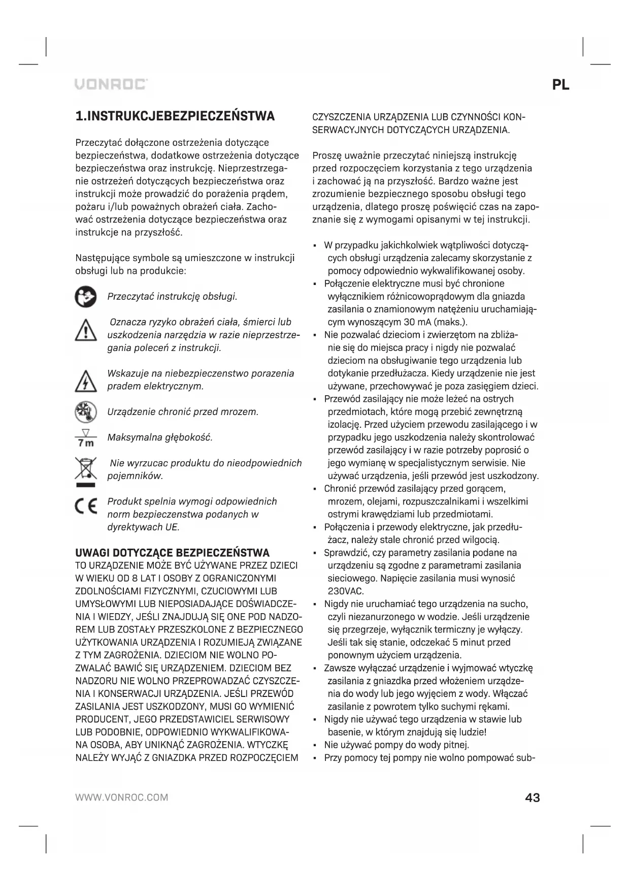 Pompa nie wyłąc- za się Zablokowany przełącznik pływakowy Umieścić przełąc- znik pływakowy niżej Pompa nie uruchamia się lub zatrzymuje podc- zas pracy. Pompa wyłączona po krótkim czasie pracy Włączył się wyłącznik termiczny chroniący przed przeciążeniem Zasilanie zostało wyłączone Zatkana turbina Zbyt ciepła woda Odłączyć od zasi- lania, pozostawić na 2 minuty i oczyścić turbinę (w razie potrzeby patrz „Zatory”) Sprawdź bezpiec- zniki i połączenia elektryczne Odłączyć pompę od zasilania i oczyścić albo odblokować turbinę (patrz „ZATORY”) Dopilnować, aby temperatura wody nie przekraczała maksymalnego poziomu 35°C ŚRODOWISKO Uszkodzone i/lub niepotrzebne urządzenia elektryczne lub elektroniczne podlegają zbiórce w odpowiednich punktach recyklingu. Tylko kraje WE Nie wyrzucać elektronarzędzi wraz z odpadami z gospodarstw domowych. Zgodnie z dyrektywą 2012/19/WE dotyczącą zużytych urządzeń elek- trycznych i elektronicznych oraz jej wdrożeniem do prawodawstwa krajowego, elektronarzędzia, które już nie nadają się do użytku, podlegają oddziel- nej zbiórce oraz utylizacji w sposób przyjazny dla środowiska. GWARANCJA Produkty VONROC są wytwarzane zgodnie z najwyż- szymi standardami jakości i producent udziela gwarancji na wady materiałowe i wady wykonania na okres wymagany prawem, licząc od dnia zaku- pu. Jeśli wystąpi usterka produktu w tym okresie spowodowana wadą materiałową i/lub wadą wykonania, proszę bezpośrednio skontaktować się ze sprzedawcą VONROC. Następujące okoliczności powodują unieważnienie gwarancji: