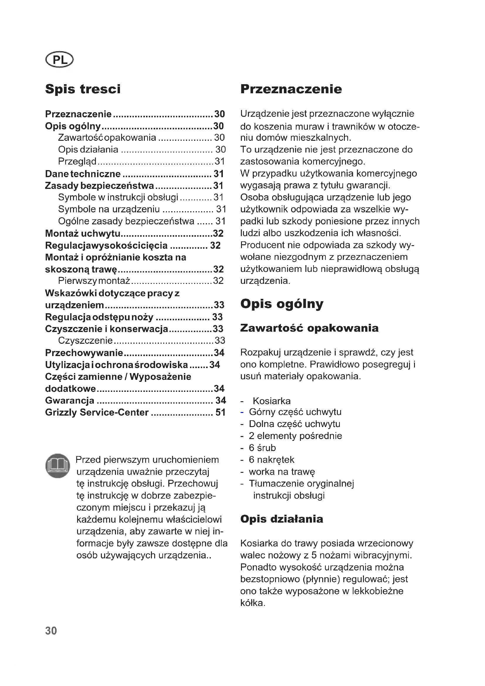 - Nie wyrzucaj skoszonej trawy do kon- tenera na śmieci; zakompostuj ją albo rozprowadź jako warstwę użyźniającą pod krzewami i drzewami. Części zamienne / Wyposażenie dodatkowe Części zamienne i akcesoria można zakupić na www.grizzly-service.eu Jeżeli nie masz dostępu do Internetu, skontaktuj się telefonicznie z Centrum Ser- wisowym (patrz „ Service-Center „) Gwarancja Na niniejsze urządzenie udzielamy 24-miesiącznej gwarancji. Szkody wywołane przez naturalne zuży- cie, przeciążenie lub nieprawidłową ob- sługę są wykluczone z zakresu gwarancji. Niektóre części urządzenia, np. walec wrzecionowy, dolną belkę metalową, ule- gają normalnemu zużyciu i są wykluczone z zakresu gwarancji. Warunkiem skorzystania z uprawnień gwarancyjnych jest ponadto przestrze- ganie podanych w tej instrukcji obsługi wskazówek dotyczących oczyszczania i konserwacji urządzenia. Szkody wywoła- ne wadami materiałowymi lub produkcyj- nymi zostaną bezpłatnie usunięte przez dostarczenie zastępczego urządzenia bądź przez naprawę. Warunkiem skorzy- stania ze świadczenia gwarancyjnego jest przekazanie urządzenia wraz z dowodem zakupu i gwarancji sklepowi, w którym na- byto urządzenie. Naprawy nie objęte gwarancją można zlecać odpłatnie naszemu centrum ser- wisowemu. Nasze Centrum Serwisowe chętnie sporządzi kosztorys naprawy. Przyjmujemy tylko urządzenia, które zostały nam przysłane w odpowiednim opakowaniu z opłaceniem pełnego kosztu przesyłki. Uwaga: W przypadku reklamacji gwa- rancyjnej lub zlecenia naprawy użytkow- nik powinien dostarczyć oczyszczone urządzenie wraz z informacją o usterce pod adres naszego punktu serwisowego. Przesyłki nadane bez uiszczenia wy- starczającej opłaty pocztowej, w cha- rakterze przesyłki o nietypowych wy- miarach, ekspresem lub inną przesyłką specjalną nie będą przyjmowane Utylizację przesłanych nam uszkodzonych urządzeń przeprowadzamy bezpłatnie.35