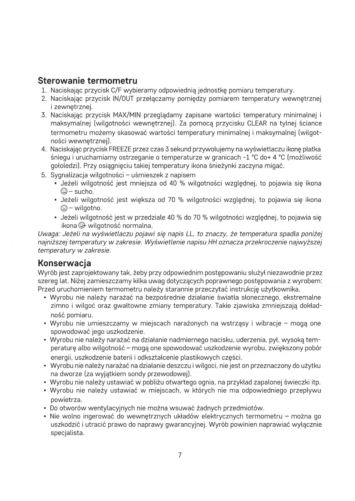 - Jeżeli wilgotność jest w przedziale 40 % do 70 % wilgotności względnej, to pojawia się ikona – wilgotność normalna. Uwaga: Jeżeli na wyświetlaczu pojawi się napis LL, to znaczy, że temperatura spadła poniżej najniższej temperatury w zakresie. Wyświetlenie napisu HH oznacza przekroczenie najwyższej temperatury w zakresie. Konserwacja Wyrób jest zaprojektowany tak, żeby przy odpowiednim postępowaniu służył niezawodnie przez szereg lat. Niżej zamieszczamy kilka uwag dotyczących poprawnego postępowania z wyrobem: Przed uruchomieniem termometru należy starannie przeczytać instrukcję użytkownika.