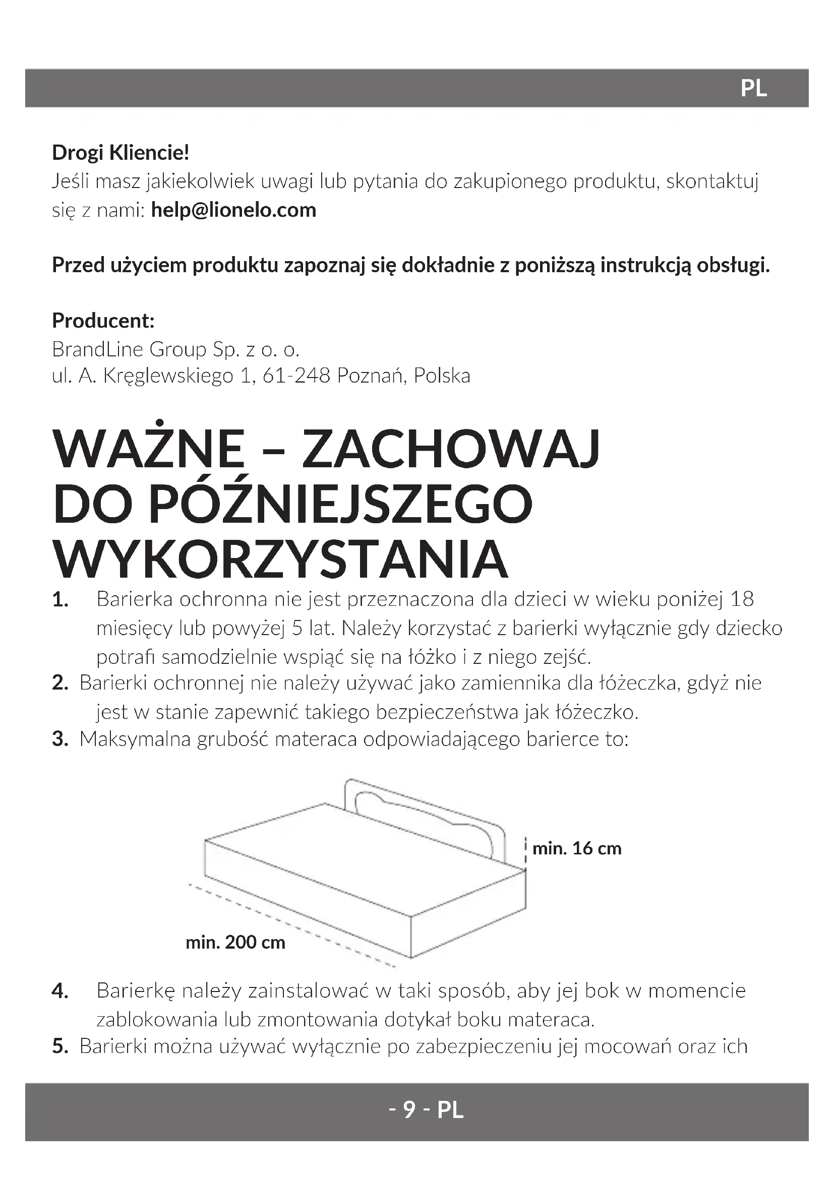 Zaczep pas o zabezpieczenie i ustaw końcówkę pomiędzy łóżkiem i materacem, następnie napnij pas za pomocą regulacji (rys. 10, 11). Czyszczenie i mycie Aby umyć pokrycie materiałowe, należy zdemontować rury i wyciągnąć je z podstawy. Zdjąć pokrycie materiałowe. Myć ręcznie, nie prasować, nie suszyć w suszarce. Produkt był testowany oraz spełnia wszystkie wymagania normy BS 7972:2001+A1:2009, EN71-3:2019 Użyte w instrukcji zdjęcia są poglądowe i mogą ulec zmianie bez konieczności informowania użytkownika. Informacje zawarte w niniejszej instrukcji mogą ulec zmianie bez konieczności informowania użytkownika.‑ 12 ‑DE Lieber Kunde! Falls Sie Fragen oder Anmerkungen zu dem gekauen Produkt haben, setzen Sie sich mit uns in Verbindung: help@lionelo.com Bevor Sie das Produkt benutzen, lesen Sie bitte genau die vorliegende Bedienungsanleitung. Hersteller: BrandLine Group Sp. z o. o. ul. A. Kręglewskiego 1, 61-248 Poznań, Polen