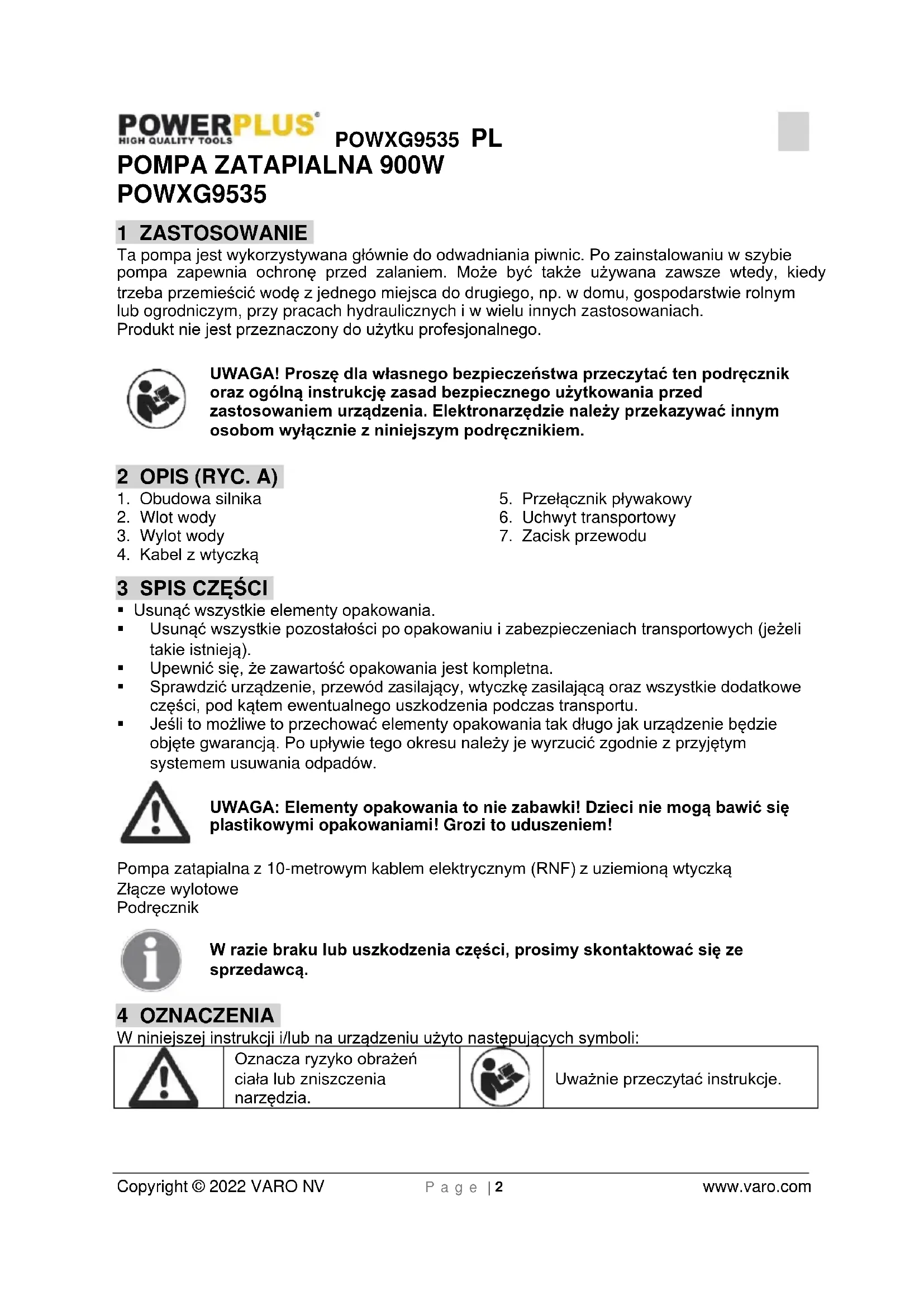 - Ustawiając przełącznik pływakowy, należy się upewnić, że nie dotyka on podstawy zanim pompa się wyłączy. Przestroga! Ryzyko pracy na sucho. To urządzenie nie może być używane przez dzieci ani osoby o upośledzonych bądź nierozwiniętych zdolnościach fizycznych lub umysłowych, a także przez osoby bez odpowiedniego doświadczenia lub wiedzy, o ile nie zostaną one odpowiednio poinstruowane - przez osobę odpowiedzialną za ich bezpieczeństwo lub brygadzistę - albo jeśli nie zaznajomią się z wyżej podanymi instrukcjami użycia tego urządzenia.POWXG9535 PL Copyright © 2022 VARO NV P a g e | 5 www.varo.com