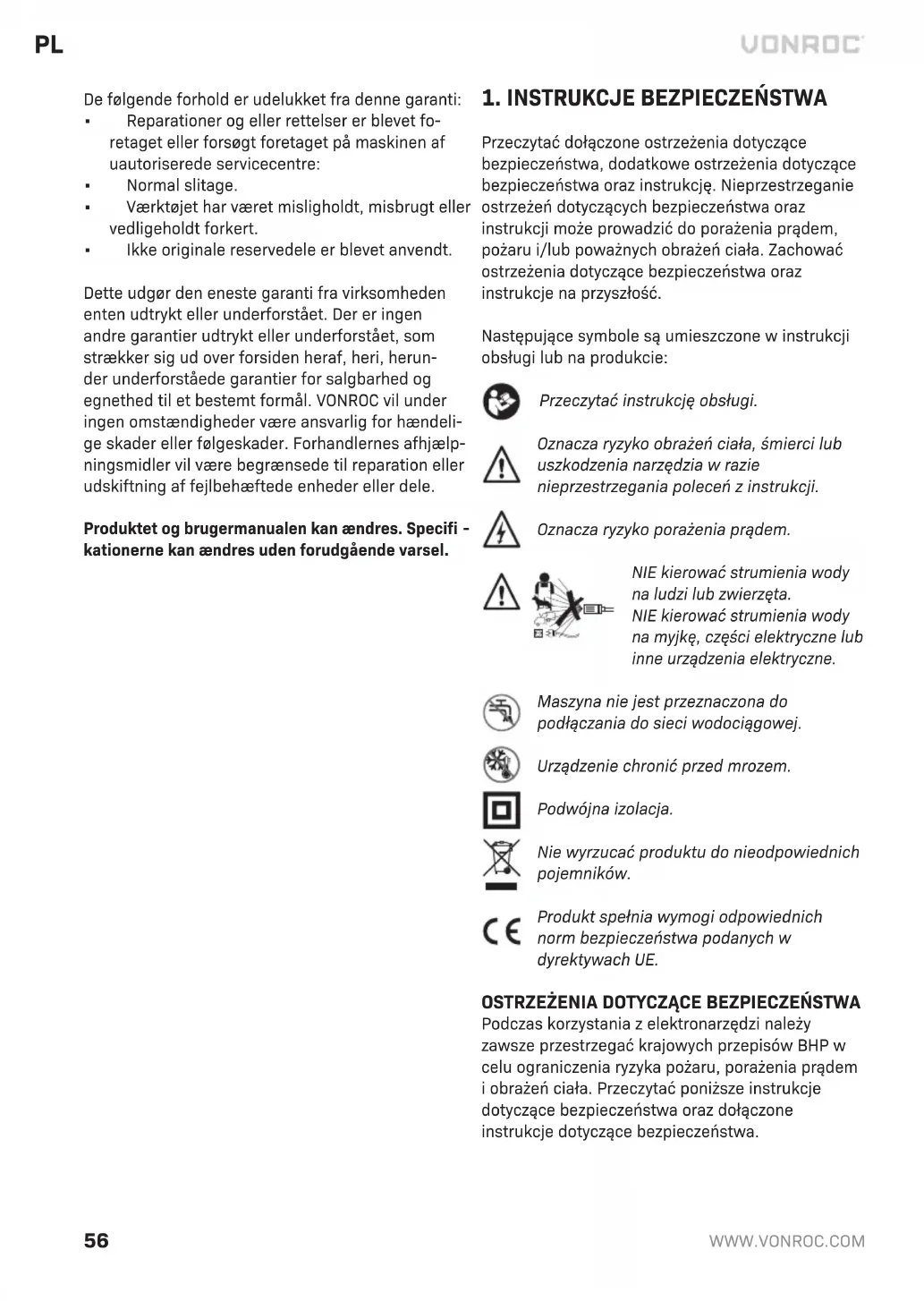 - Poluzować i dokręcić ponownie śrubę regulacji. Sprawdzić i/lub wymienić. Naprawy i serwisowanie może przeprowad- zać jedynie odpowiednio wykwalifi kowany technik lub serwis. SRODOWISKO Uszkodzone i/lub niepotrzebne urzadzenia elektryczne lub elektroniczne podlegaja zbiórce w odpowiednich punktach recyklingu. Tylko kraje WE Nie wyrzucac elektronarzedzi wraz z odpadami z gospodarstw domowych. Zgodnie z dyrektywa 2012/19/WE dotyczaca zuzytych urzadzen elek- trycznych i elektronicznych oraz jej wdrozeniem do prawodawstwa krajowego, elektronarzedzia, które juz nie nadaja sie do uzytku, podlegaja oddziel- nej zbiórce oraz utylizacji w sposób przyjazny dla srodowiska. GWARANCJA Produkty VONROC są wytwarzane zgodnie z naj- wyższymi standardami jakości i producent udziela gwarancji na wady materiałowe i wady wykonania na okres wymagany prawem, licząc od dnia zaku- pu. Jeśli wystąpi usterka produktu w tym okresie spowodowana wadą materiałową i/lub wadą wykonania, proszę bezpośrednio skontaktować się ze sprzedawcą VONROC. Następujące okoliczności powodują unieważnienie gwarancji: