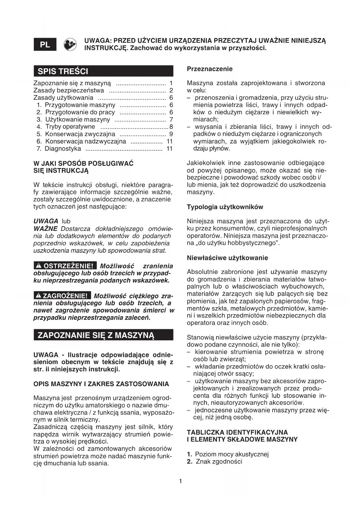 Zapoznanie się z maszyną ............................ 1 Zasady bezpieczeństwa ................................ 2 Zasady użytkowania ...................................... 6