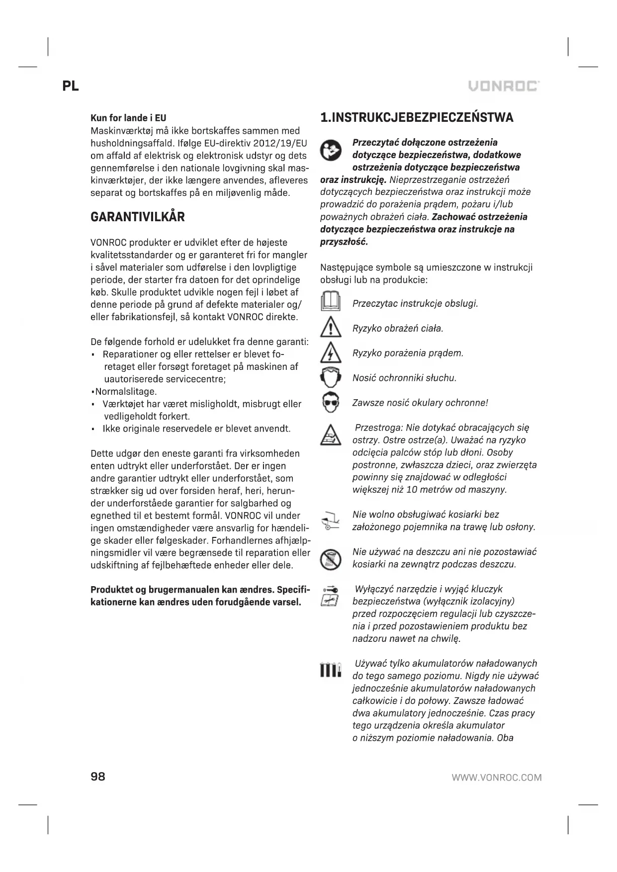 - Użyto części zamiennych innych niż oryginalne. Niniejsza gwarancja to wyłączna gwarancja producenta inie obowiązują żadne inne wyrażo- ne ani dorozumiane gwarancje. Nie obowiązują żadne inne wyrażone ani dorozumiane gwarancje ozakresie przekraczającym niniejszą gwarancję, co obejmuje dorozumiane gwarancje przydatności do sprzedaży iprzydatności do określonego celu. W żadnym przypadku firma VONROC nie ponosi odpo- wiedzialności za straty przypadkowe lub wynikowe. Zadośćuczynienie sprzedawcy jest ograniczone do naprawy lub wymiany niezgodnych urządzeń lub części. Produkt iinstrukcja obsługi podlegają zmianom. Dane techniczne podlegają zmianom bez uprzed- zenia.