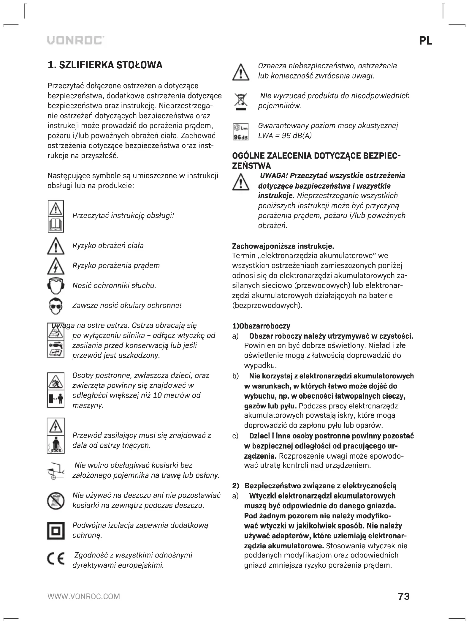 płynie. Do czyszczenia nie należy używać żadny- ch środków ściernych ani rozpuszczalników. ŚRODOWISKO Uszkodzone oraz /lub wybrakowane urządzenie elektryczne lub elektroniczne musi być utylizowane w odpowiedni sposób. Tylko dla krajów Komisji Europejskiej Nie wolno wyrzucać elektronarzędzi do domowych śmietników. Zgodnie z Dyrektywą Europejską nr 2012/19/EU dotyczącą Utylizacji Wyposażenia Elektrycznego i Elektronicznego i jej wdrożeniem w krajowe prawo, nieużywane elektronarzędzia należy gromadzić oddzielnie i utylizować w sposób przyjazny dla środowiska. GWARANCJA Produkty VONROC są wytwarzane zgodnie z naj- wyższymi standardami jakości i producent udziela gwarancji na wady materiałowe i wady wykonania na okres wymagany prawem, licząc od dnia zaku- pu. Jeśli wystąpi usterka produktu w tym okresie spowodowana wadą materiałową i/lub wadą wykonania, proszę bezpośrednio skontaktować się ze sprzedawcą VONROC. Następujące okoliczności powodują unieważnienie gwarancji: