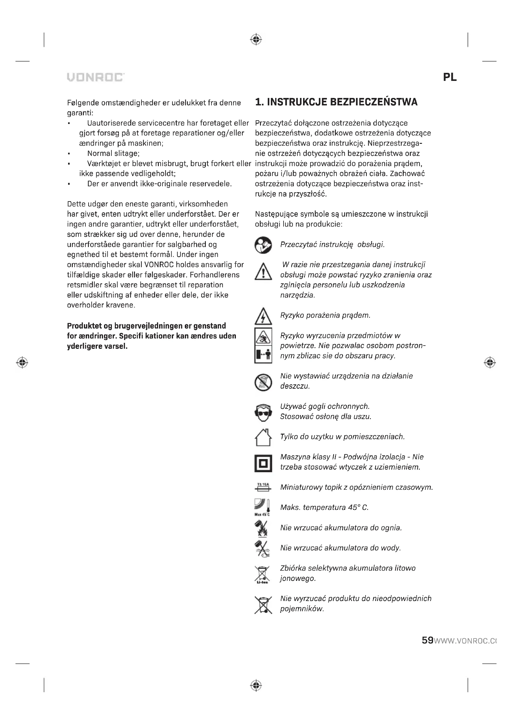 Przed rozpoczeciem czyszczenia i konser- wacji zawsze wylaczac maszyne i wyjmo- wac z niej akumulator. Czyścić obudowę maszyny regularnie miękką ściereczką, najlepiej po każdym użyciu. Dopil- nować, aby otwory wentylacyjne były wolne od pyłu, kurzu i zabrudzeń. Usuwać oporne zabrudze- nia miękką ściereczką zwilżoną mydlinami. Nie uży- wać żadnych rozpuszczalników, takich jak benzyna, alkohol, amoniak itp. Takie substancje chemiczne spowodują uszkodzenie części z tworzyw sztuc- znych. SRODOWISKO Uszkodzone i/lub niepotrzebne urzadzenia elektryczne lub elektroniczne podlegaja zbiórce w odpowiednich punktach recyklingu. Tylko kraje WE Nie wyrzucac elektronarzedzi wraz z odpadami z gospodarstw domowych. Zgodnie z dyrektywa 2012/19/WE dotyczaca zuzytych urzadzen elek- trycznych i elektronicznych oraz jej wdrozeniem do prawodawstwa krajowego, elektronarzedzia, które juz nie nadaja sie do uzytku, podlegaja oddziel- nej zbiórce oraz utylizacji w sposób przyjazny dla srodowiska. GWARANCJA Produkty VONROC są wytwarzane zgodnie z naj- wyższymi standardami jakości i producent udziela gwarancji na wady materiałowe i wady wykonania na okres wymagany prawem, licząc od dnia zaku- pu. Jeśli wystąpi usterka produktu w tym okresie spowodowana wadą materiałową i/lub wadą wykonania, proszę bezpośrednio skontaktować się ze sprzedawcą VONROC. Następujące okoliczności powodują unieważnienie gwarancji: