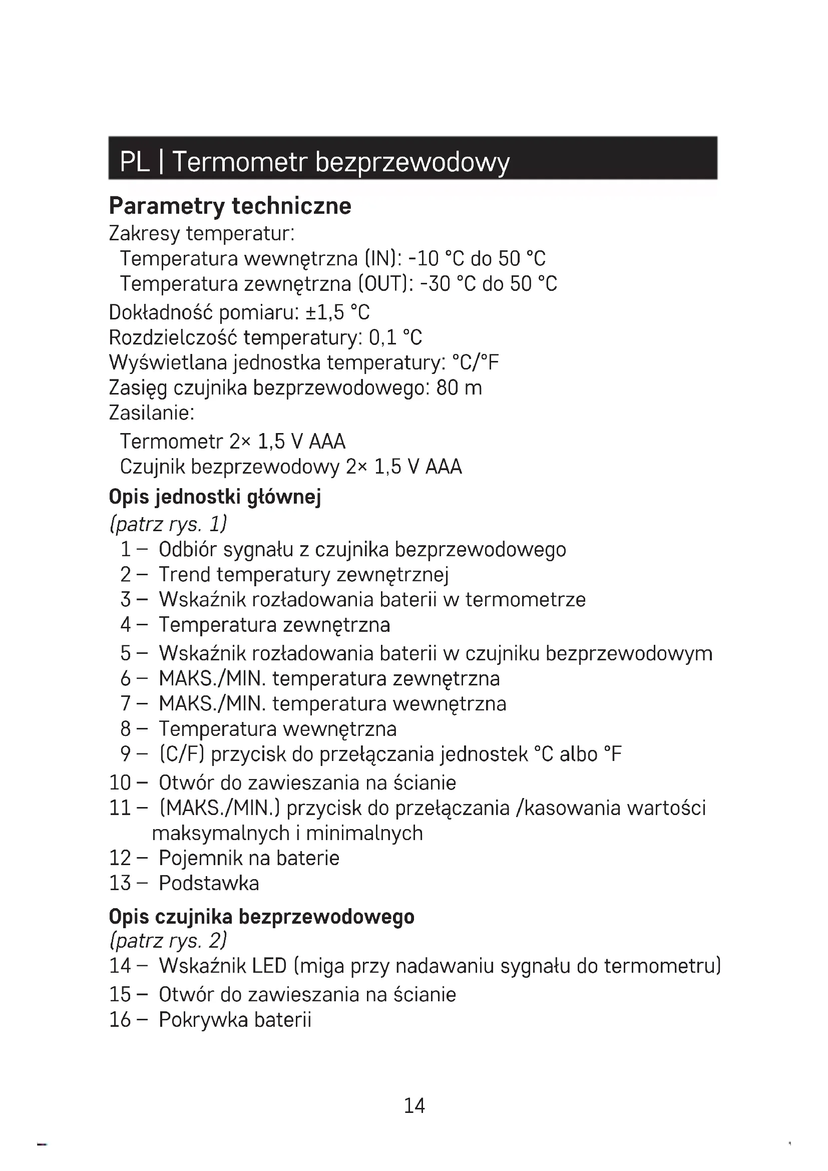 - Tento prístroj nie je určený pre používanie osobami (vrátane detí), ktorým fyzická, zmyslová alebo mentálna neschopnosť či nedostatok skúseností a znalostí zabraňuje v bezpečnom používaní prístroja, pokiaľ na ne nebude dohliadané alebo pokiaľ neboli inštruované ohľadne použitia tohto prístroja osobou zod- povednou za ich bezpečnosť. Je nutný dohľad nad deťmi, aby sa zaistilo, že sa nebudú s prístrojom hrať. Teplomer a batérie sa po použití stávajú nebezpečným odpadom, nevyhadzujte ich do bežného komunálneho odpadu, ale odovzdajte ich na mieste spätného odberu - napr. v obchode, kde ste prístroj zakúpili. EMOS spol. s r. o. týmto vyhlasuje, že rádiové zariadenie typu E0129 je v súlade so smernicou 2014/53/EÚ. Úplné EÚ vy- hlásenie o zhode je k dispozícii na tejto internetovej adrese: http://www.emos.eu/download.14 PL | Termometr bezprzewodowy Parametry techniczne Zakresy temperatur: Temperatura wewnętrzna (IN): -10 °C do 50 °C Temperatura zewnętrzna (OUT): -30 °C do 50 °C Dokładność pomiaru: ±1,5 °C Rozdzielczość temperatury: 0,1 °C Wyświetlana jednostka temperatury: °C/°F Zasięg czujnika bezprzewodowego: 80 m Zasilanie: Termometr 2× 1,5 V AAA Czujnik bezprzewodowy 2× 1,5 V AAA Opis jednostki głównej (patrz rys. 1) 1 – Odbiór sygnału z czujnika bezprzewodowego 2 – Trend temperatury zewnętrznej 3 – Wskaźnik rozładowania baterii w termometrze 4 – Temperatura zewnętrzna 5 – Wskaźnik rozładowania baterii w czujniku bezprzewodowym 6 – MAKS./MIN. temperatura zewnętrzna 7 – MAKS./MIN. temperatura wewnętrzna 8 – Temperatura wewnętrzna 9 – (C/F) przycisk do przełączania jednostek °C albo °F 10 – Otwór do zawieszania na ścianie 11 – (MAKS./MIN.) przycisk do przełączania /kasowania wartości maksymalnych i minimalnych 12 – Pojemnik na baterie 13 – Podstawka Opis czujnika bezprzewodowego (patrz rys. 2) 14 – Wskaźnik LED (miga przy nadawaniu sygnału do termometru) 15 – Otwór do zawieszania na ścianie 16 – Pokrywka baterii15 Uruchomienie do pracy