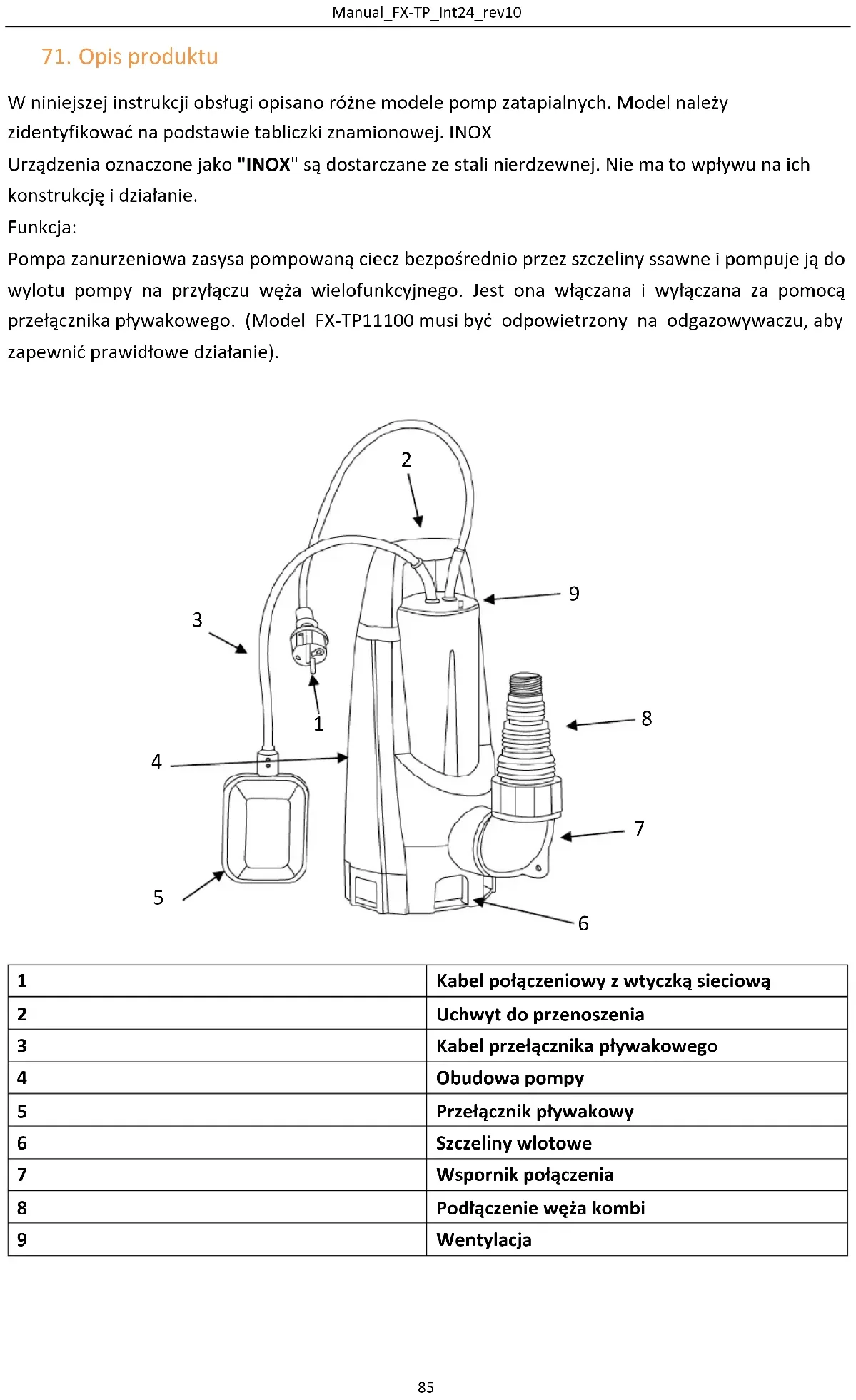 W niniejszej instrukcji obsługi opisano różne modele pomp zatapialnych. Model należy zidentyfikować na podstawie tabliczki znamionowej. INOX Urządzenia oznaczone jako "INOX" są dostarczane ze stali nierdzewnej. Nie ma to wpływu na ich konstrukcję i działanie. Funkcja: Pompa zanurzeniowa zasysa pompowaną ciecz bezpośrednio przez szczeliny ssawne i pompuje ją do wylotu pompy na przyłączu węża wielofunkcyjnego. Jest ona włączana i wyłączana za pomocą przełącznika pływakowego. (Model FX-TP11100 musi być odpowietrzony na odgazowywaczu, aby zapewnić prawidłowe działanie).