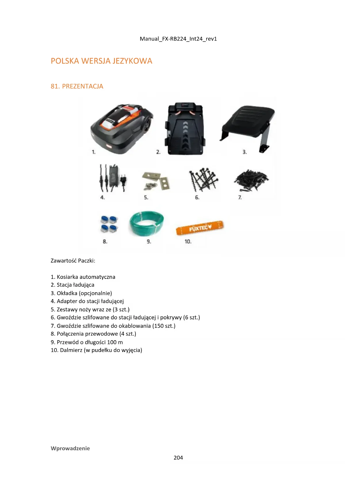 Przeczytaj uważnie instrukcję obsługi, aby móc prawidłowo korzystać z kosiarki zautomatyzowanej. Aby bezpiecznie i wydajnie korzystać z kosiarki, należy dokładnie przestrzegać ostrzeżeń i środków ostrożności zawartych w niniejszej instrukcji obsługi. Przeglądy i konserwację należy przeprowadzać przy wyłączonym wyłączniku zasilania (0). Podczas pracy przedmioty można wyrzucać z kosiarki. Podczas pracy należy zachować bezpieczną odległość od maszyny. Ostrożnie. Pamiętaj, aby trzymać ręce i stopy z dala od obracających się ostrzy Nie używaj kosiarki jako środka transportu. Zachowaj odpowiednią odległość od kosiarki i upewnij się, że dzieci i zwierzęta nie mogą się do niej zbliżyć.Manual_FX-RB224_Int24_rev1