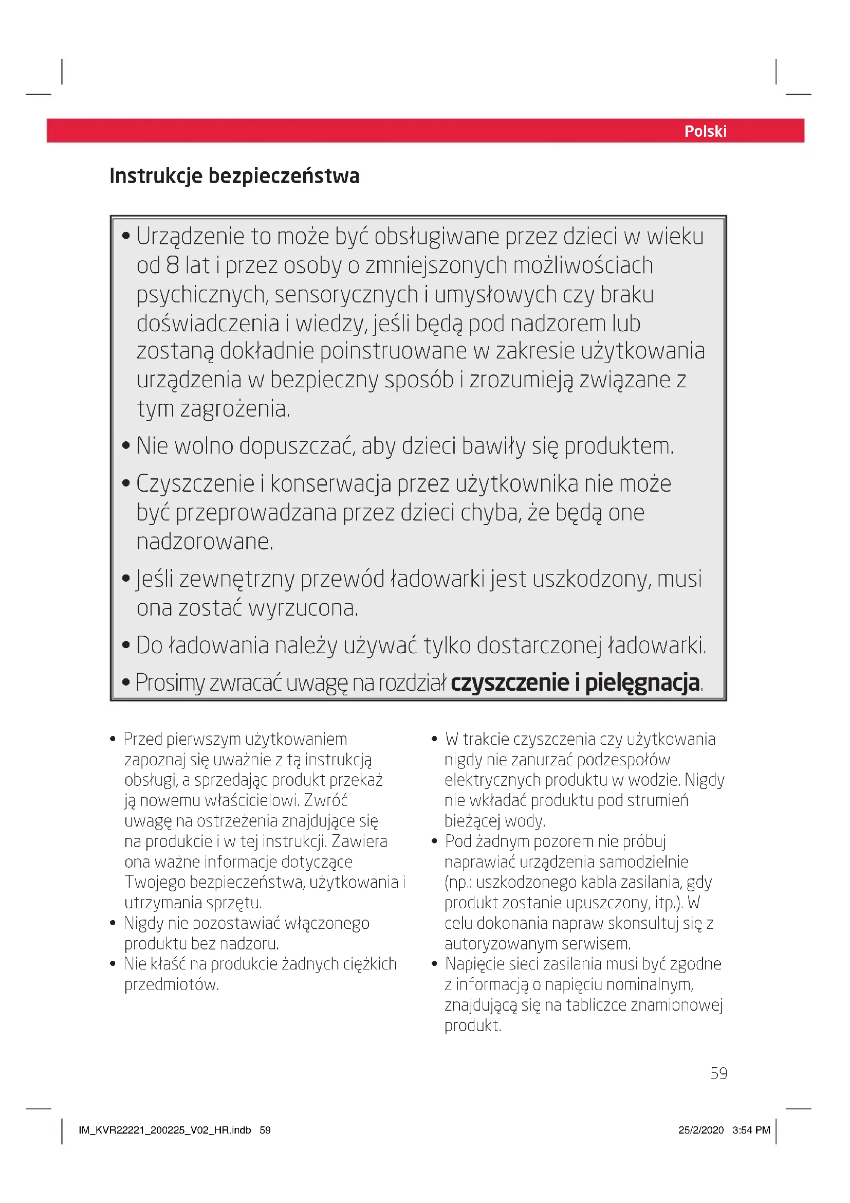 - Napięcie sieci zasilania musi być zgodne z informacją o napięciu nominalnym, znajdującą się na tabliczce znamionowej produkt. IM_KVR22221_200225_V02_HR.indb 59IM_KVR22221_200225_V02_HR.indb 59 25/2/2020 3:54 PM25/2/2020 3:54 PMSize = A5 Polski