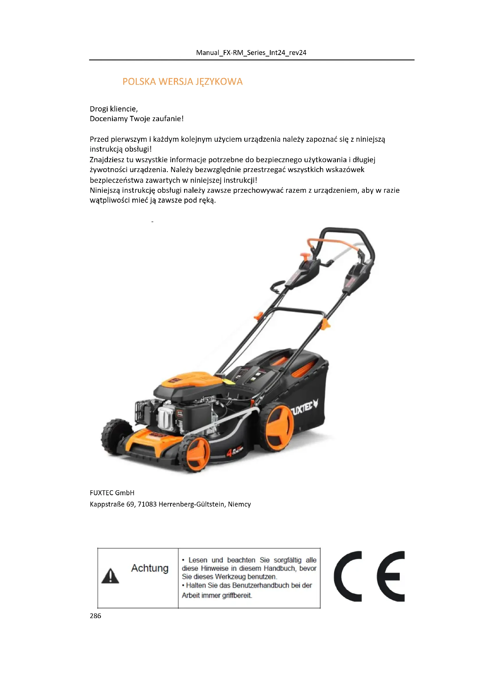 Niniejszym oświadczamy FUXTEC GmbH Kappstrasse69, 71083 Herrenberg-Gültstein - Niemcy że urządzenie wskazane poniżej Kosiarka spalinowa, FX-RM5196, FX-RM5196PRO, FX-RM5196eS, FX-RM5396P, FX- RM5396PeSPRO,FX-RM4646, FX-RM4646ECO, RM4346ECO, RM4346, RM4646, RM5196eSPRO do którego odnosi się niniejsza deklaracja, jest zgodny z odpowiednimi zasadniczymi wymaganiami dotyczącymi zdrowia i bezpieczeństwa określonymi w odpowiednich dyrektywach WE 2006/42/WE. Niniejsza deklaracja odnosi się wyłącznie do maszyny w stanie, w jakim została wprowadzona do obrotu; części zamontowane później przez użytkownika końcowego i/lub interwencje przeprowadzone później nie są brane pod uwagę. Odpowiednie dyrektywy WE: Dyrektywa maszynowa 2006/42/WE (załącznik I) Zastosowane normy zharmonizowane: EN ISO 5395-1:2013+A1