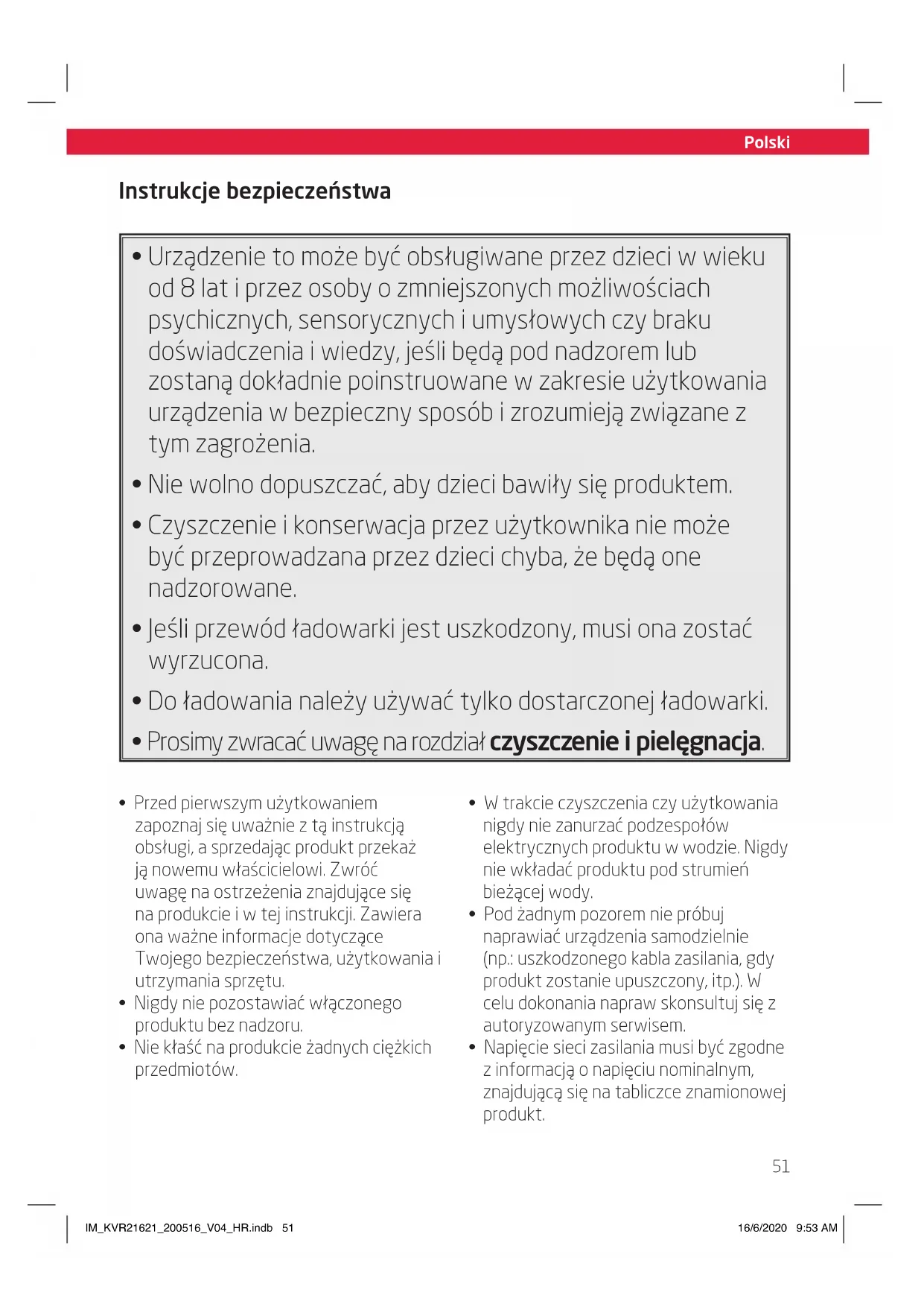 - Napięcie sieci zasilania musi być zgodne z informacją o napięciu nominalnym, znajdującą się na tabliczce znamionowej produkt. IM_KVR21621_200516_V04_HR.indb 51IM_KVR21621_200516_V04_HR.indb 51 16/6/2020 9:53 AM16/6/2020 9:53 AMSize - A5 Polski