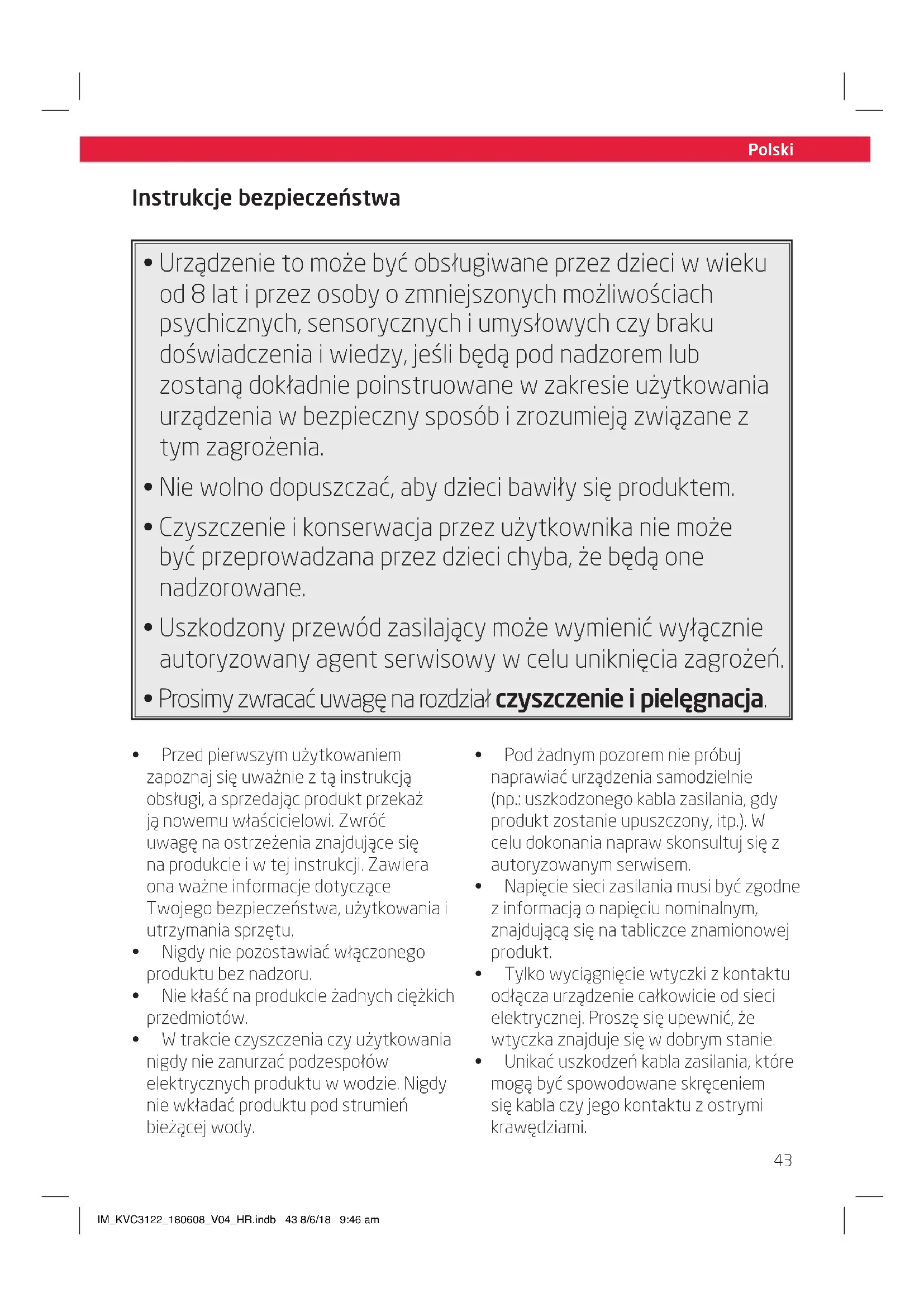 - Unikać uszkodzeń kabla zasilania, które mogą być spowodowane skręceniem się kabla czy jego kontaktu z ostrymi krawędziami. IM_KVC3122_180608_V04_HR.indb 43 8/6/18 9:46 amSize - A5 Polski