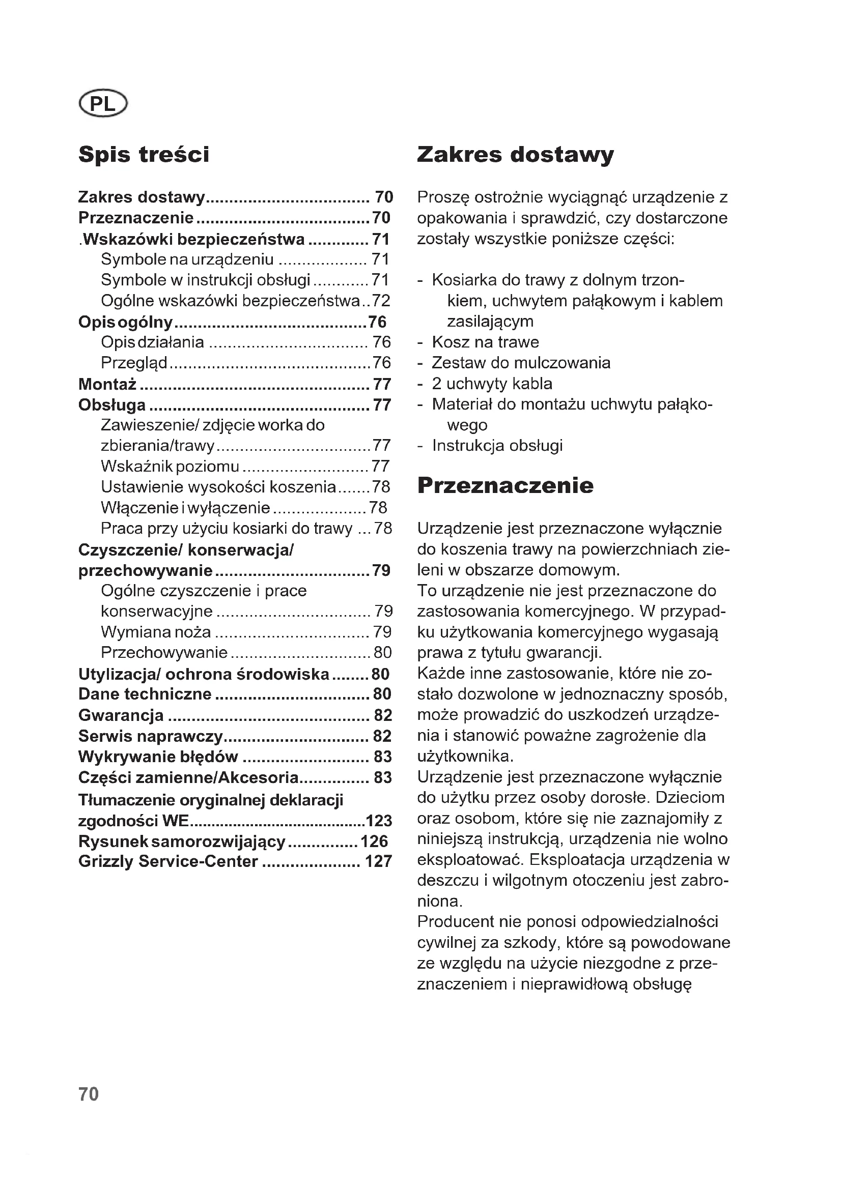 Wykrywanie błędów Problem Możliwa przyczyna Usuwanie błędów Urządzenie nie uruchamia się Zanik napięcia sieciowego Sprawdzić gniazdo wtykowe, kabel, przewód, wtyczkę, ewentualnie zlecić naprawę fachowcowi-elek- trykowi Dźwignia włączająca ( 2) lub przycisk odryglowujący ( 17) jest uszkodzony Naprawa przez serwis Szczotki węglowe są zużyte Uszkodzony silnik Trawa jest za długa Ustawić wyższą wysokość ko- szenia. Podnieść lekko przednie kółka poprzez naciśnięcie na pałąk uchwytowy Silnik wyłącza się Blokada przez obce ciało Usunąć obce ciała Wynik koszenia nie jest zadawala- jący lub utrudnio- na praca silnika Wysokość koszenia jest za mała Ustawić mniejszą wysokość ko- szenia Nóż jest ( 20) tępy Zlecić naostrzenie noża lub go wymienić Komora noża jest zatkana Wyczyścić urządzenie Nóż jest ( 20)) zamontowany w nieprawidłowy sposób Zamontować nóż w prawidłowy sposób Nóż nie obraca się Nóż jest ( 20)zablokowany przez trawę Usunąć trawę Śruba noża jest ( 20) poluzo- wana Dokręcić śrubę noża Nienormalne od- głosy, stukanie lub wi- bracje Śruba noża jest ( 20) poluzo- wana Dokręcić śrubę noża Nóż jest ( 20) uszkodzony Wymienić nóż Części zamienne/Akcesoria Części zamienne i akcesoria można zakupić na www.grizzly-service.eu Jeżeli nie masz dostępu do Internetu, skontaktuj się z Centrum Serwisowym (patrz „ Grizzly Service-Center „)CZ