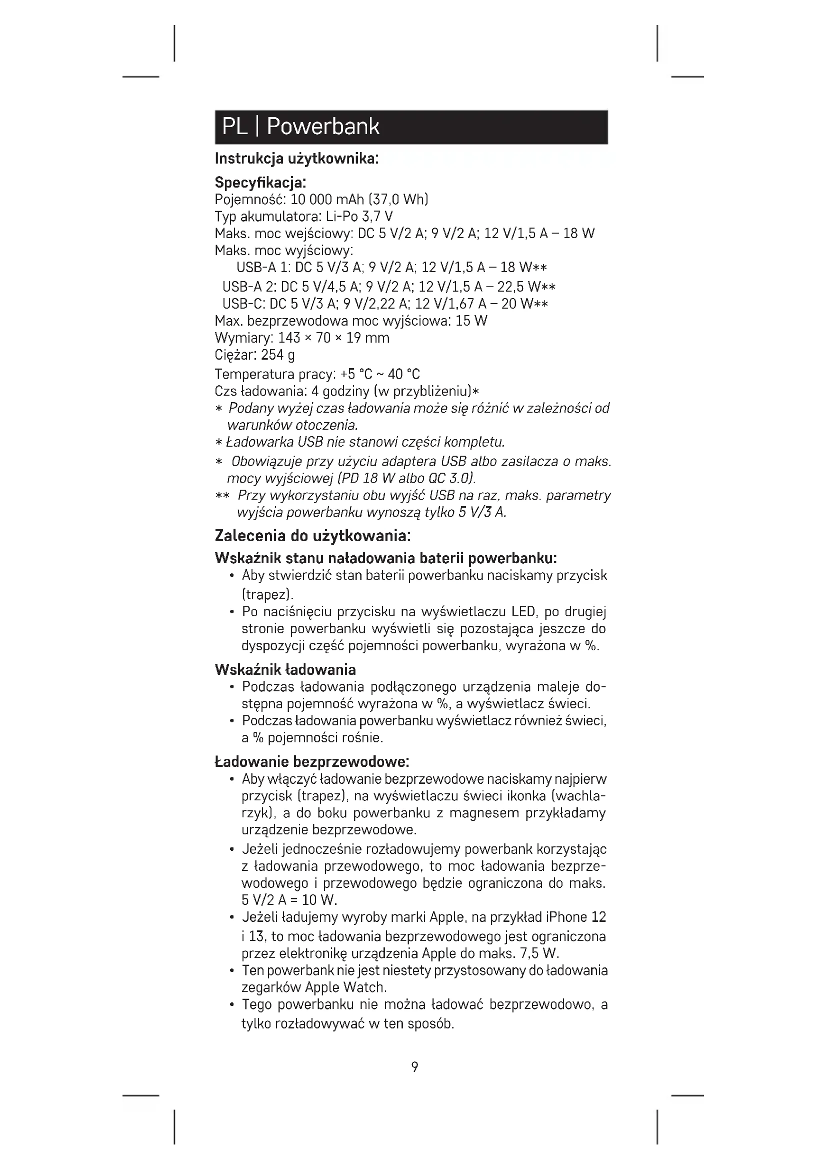 - Aby przedłużyć żywotność baterii powerbanku należy utrzymywać poziom naładowania baterii powerbanku w zakresie 25–75 %. Obsługiwane urządzenia: tablety, telefony komkórkowe, aparaty fotograczne, kamery video, odtwarzacze MP3, nawigacje GPS, soundboxy. Pierwsze ładowanie może zająć nieco więcej czasu. Przed użyciem należy uważnie przeczytać instrukcję użyt- kownika. Normalnym zjawiskiem jest to, że obudowa powerbanku w czasie ładowania i podczas pracy rozgrzewa się. Po zakończeniu tych operacji jej temperatura automatycznie maleje do temperatury otoczenia. Jeżeli ładowanie nie rozpocznie się w czasie do 3 sekund, to powerbank należy wyłączyć i ponownie włączyć. Po naładowaniu odłączamy wszystkie przewody, a powerbank wyłączy się automatycznie. Do ładowania i korzystania z powerbanku można zastosować przewód z kompletu (w przypadku, gdy jest częścią zestawu), albo dowolny inny przewód USB o wysokiej jakości. Aby zapewnić jak najkrótszy czas ładowania powerbanku sto- sujemy adapter USB i przewód przystosowany do przewodzenia takiego samego albo większego prądu, niż prąd wejściowy powerbanku. Opakowanie tego produktu zawiera metalowy pierścień, który jest dołączony do produktu w celu zapewnienia lepszej kompa- tybilności, szybkości i stabilności ładowania bezprzewodowego. Przed założeniem pierścienia należy zawsze najpierw sprawdzić działanie funkcji ładowania. Możliwe jest, że ładowanie bezprze- wodowe niektórych modeli telefonów komórkowych może nie działać optymalnie z tym pierścieniem. Pierścień można przykleić bezpośrednio na obudowie telefonu lub na pokrywie telefonu. Przed przyklejeniem pierścienia należy najpierw przymocować go do podstawy MagSafe banku energii. Następnie podłącz telefon do powerbanku, aby ładowanie prze- biegło pomyślnie. Pomoże to określić, gdzie i w jakim kierunku należy przykleić pierścień. Używając pierścienia przyklejonego do ładowanego urządze- nia, uzyskasz silniejsze połączenie z magnetyczną podstawą bezprzewodową powerbanku. W przypadku niektórych modeli telefonów można również uzyskać większą stabilność i szybsze11 ładowanie (podczas szybkiego ładowania bezprzewodowego na wyświetlaczu powerbanku zaświeci się zielona ikona błyskawicy). W przypadku niektórych modeli telefonów ładowanie bezprze- wodowe za pomocą tego powerbanku działa tylko wtedy, gdy używany jest pierścień. Jeśli więc ładowanie bezprzewodowe nie działa w Twoim przypadku, spróbuj użyć tego pierścienia. Na ładowanie bezprzewodowe ma również wpływ korzystanie z osłony ochronnej telefonu. Jeśli więc ładowanie bezprzewodowe nie działa, spróbuj korzystać z niego bez tego pokrowca. Możesz także użyć tego pierścienia, jeśli Twój telefon jest telefo- nem Apple i jest wyposażony w mechanizm MagSafe. Ten bank energii może ładować wybrane modele urządzeń „Air- pod”, ale bez użycia metalowego pierścienia. To urządzenie nie jest przeznaczone do użytkowania przez osoby (łącznie z dziećmi), którym niezdolność zyczna, umysłowa albo mentalna, ewentualnie brak wiedzy albo doświadczenia, uniemożliwia bezpieczne korzystanie z tego urządzenia, o ile nie jest nad nimi sprawowany nadzór albo, jeżeli nie zostały odpo- wiednio poinstruowane o zasadach użytkowania tego urządzenia przez osobę odpowiedzialną za ich bezpieczeństwo. Wyrób należy chronić przed wilgocią, wodą i innymi cieczami, źródłami ciepła i jakiegokolwiek innego silnego promieniowania. Wyrobu nie wolno rozbierać, zwierać go i wyginać. Należy go chronić przed ciężkimi przedmiotani i gwałtownymi uderzeniami. Zgodnie z przepisami Ustawy o ZSEiE zabronione jest umieszczanie łącznie z innymi odpadami zużytego sprzę- tu oznakowanego symbolem przekreślonego kosza. Użytkownik, chcąc pozbyć się sprzętu elektronicznego i elek- trycznego, jest zobowiązany do oddania go do punktu zbierania zużytego sprzętu. W sprzęcie nie znajdują się składniki niebez- pieczne, które mają szczególnie negatywny wpływ na środowisko i zdrowie ludzi. HU | Powerbank Használati útmutató: Jellemzők: Kapacitás: 10 000 mAh (37,0 Wh) Akkumulátor típusa: Li-Po 3,7 V Max. bemeneti teljesítmény: DC 5 V/2 A; 9 V/2 A; 12 V/1,5 A – 18 W Max. kimeneti teljesítmény: USB-A 1: DC 5 V/3 A; 9 V/2 A; 12 V/1,5 A – 18 W** USB-A 2: DC 5 V/4,5 A; 9 V/2 A; 12 V/1,5 A – 22,5 W** USB-C: DC 5 V/3 A; 9 V/2,22 A; 12 V/1,67 A – 20 W** Vezeték nélküli töltés max. teljesítménye: 15 W Méret: 143 × 70 × 19 mm Súly: 254 g Működési hőmérséklet: +5 °C ~ 40 °C Töltési idő: 4 óra (körülbelül)*
