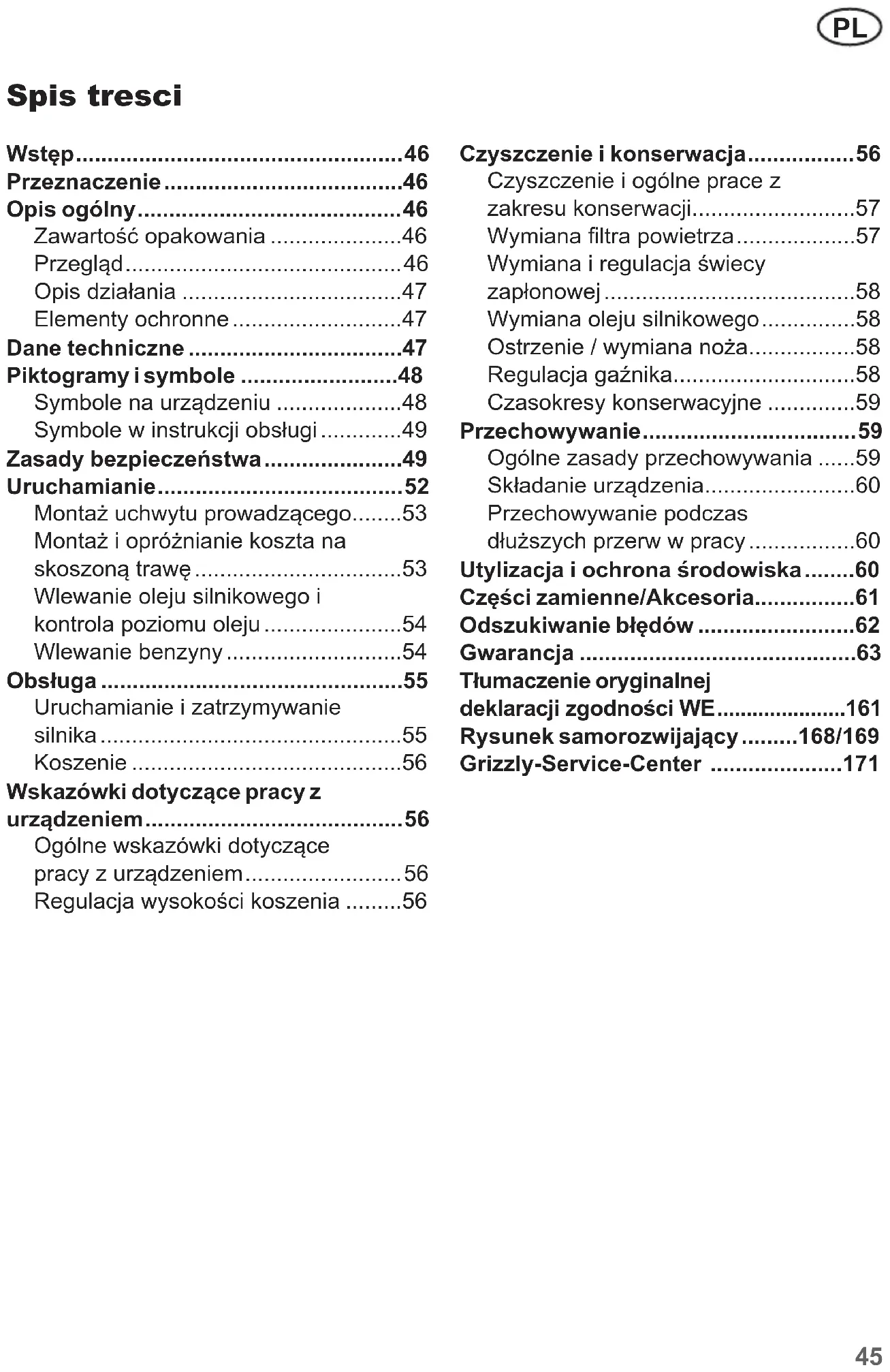 Przypierwszymkoszeniutrawyw sezonienależywybraćdużąwyso- kośćkoszenia. Czyszczenie i konserwacja Wykonywanie prac naprawczych i konserwacyjnych, które nie są wymienione w niniejszej in- strukcji obsługi, należy zlecać specjalistycznemu warsztatowi. Używaj tylko oryginalnych czę- ści zamiennych Grizzly. Wszystkie prace konserwacyjne i oczyszczanie przeprowadzaj zasadniczo przy wyłączonym sil- niku i odłączonej wtyczce świe- cy zapłonowej. Niebezpieczeń- stwo zranienia! Przed wszelkimi pracami konserwacyjnymi i oczyszczaniem zaczekaj, aż urządzenie wystygnie. Elementy silnika są gorące. Niebezpie- czeństwo oparzenia!57