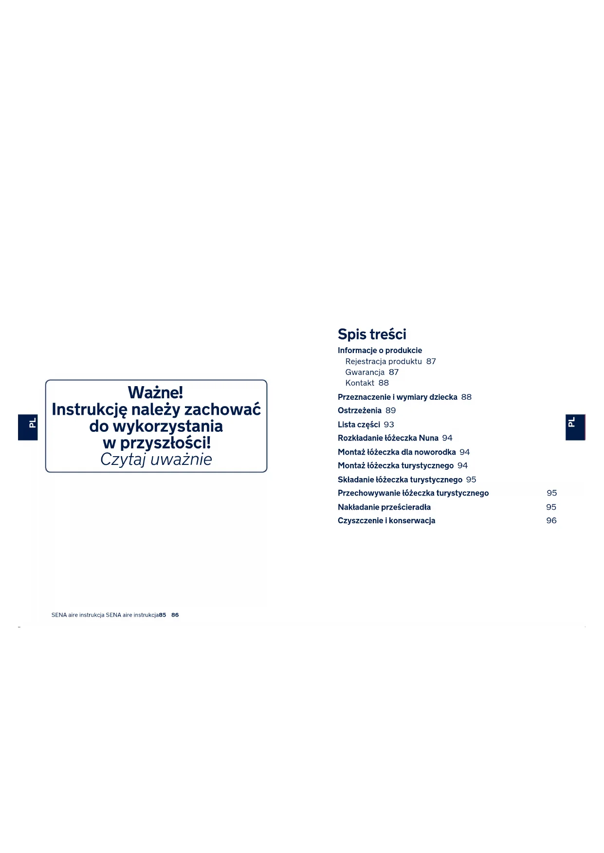 Ważne! Instrukcję należy zachować do wykorzystania w przyszłości! Czytaj uważnie Spis treści Informacje o produkcie Rejestracja produktu 87 Gwarancja 87 Kontakt 88 Przeznaczenie i wymiary dziecka 88 Ostrzeżenia 89 Lista części 93 Rozkładanie łóżeczka Nuna 94 Montaż łóżeczka dla noworodka 94 Montaż łóżeczka turystycznego 94 Składanie łóżeczka turystycznego 95 Przechowywanie łóżeczka turystycznego 95 Nakładanie prześcieradła 95 Czyszczenie i konserwacja 96SENA aire instrukcja SENA aire instrukcja87 88