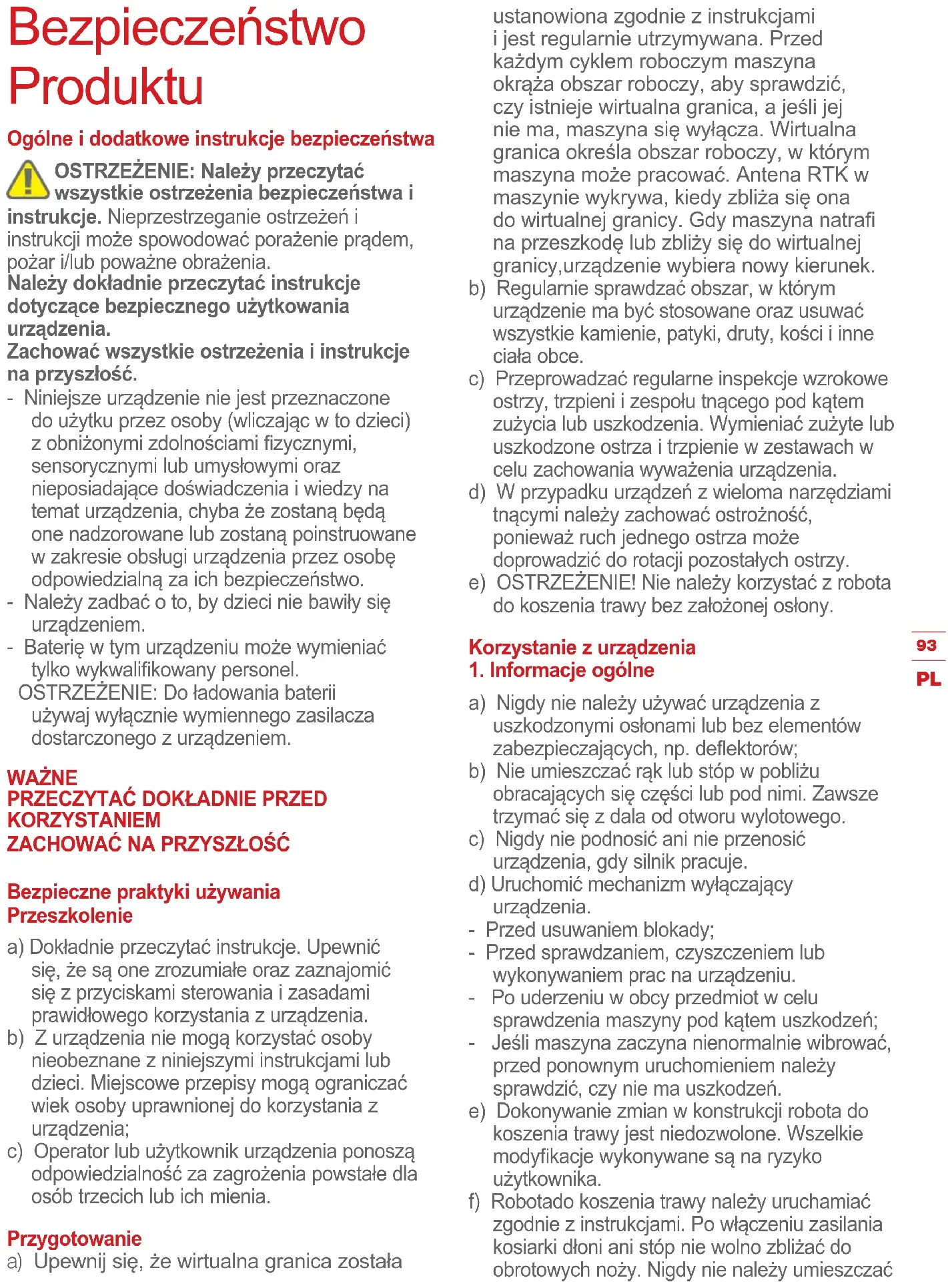 Bezpieczne praktyki używania Przeszkolenie a) Dokładnie przeczytać instrukcje. Upewnić się, że są one zrozumiałe oraz zaznajomić się z przyciskami sterowania i zasadami prawidłowego korzystania z urządzenia. b) Z urządzenia nie mogą korzystać osoby nieobeznane z niniejszymi instrukcjami lub dzieci. Miejscowe przepisy mogą ograniczać wiek osoby uprawnionej do korzystania z urządzenia; c) Operator lub użytkownik urządzenia ponoszą odpowiedzialność za zagrożenia powstałe dla osób trzecich lub ich mienia. Przygotowanie a) Upewnij się, że wirtualna granica została ustanowiona zgodnie z instrukcjami i jest regularnie utrzymywana. Przed każdym cyklem roboczym maszyna okrąża obszar roboczy, aby sprawdzić, czy istnieje wirtualna granica, a jeśli jej nie ma, maszyna się wyłącza. Wirtualna granica określa obszar roboczy, w którym maszyna może pracować. Antena RTK w maszynie wykrywa, kiedy zbliża się ona do wirtualnej granicy. Gdy maszyna natra na przeszkodę lub zbliży się do wirtualnej granicy,urządzenie wybiera nowy kierunek. b) Regularnie sprawdzać obszar, w którym urządzenie ma być stosowane oraz usuwać wszystkie kamienie, patyki, druty, kości i inne ciała obce. c) Przeprowadzać regularne inspekcje wzrokowe ostrzy, trzpieni i zespołu tnącego pod kątem zużycia lub uszkodzenia. Wymieniać zużyte lub uszkodzone ostrza i trzpienie w zestawach w celu zachowania wyważenia urządzenia. d) W przypadku urządzeń z wieloma narzędziami tnącymi należy zachować ostrożność, ponieważ ruch jednego ostrza może doprowadzić do rotacji pozostałych ostrzy. e) OSTRZEŻENIE! Nie należy korzystać z robota do koszenia trawy bez założonej osłony. Korzystanie z urządzenia