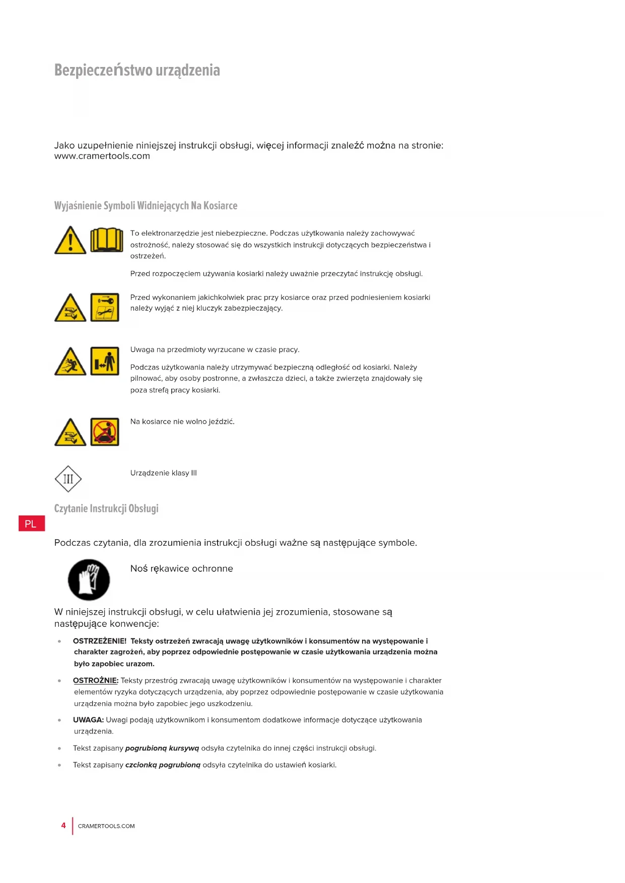 Wyjaśnienie Symboli Widniejących Na Kosiarce To elektronarzędzie jest niebezpieczne. Podczas użytkowania należy zachowywać ostrożność, należy stosować się do wszystkich instrukcji dotyczących bezpieczeństwa i ostrzeżeń. Przed rozpoczęciem używania kosiarki należy uważnie przeczytać instrukcję obsługi. Przed wykonaniem jakichkolwiek prac przy kosiarce oraz przed podniesieniem kosiarki należy wyjąć z niej kluczyk zabezpieczający. Uwaga na przedmioty wyrzucane w czasie pracy. Podczas użytkowania należy utrzymywać bezpieczną odległość od kosiarki. Należy pilnować, aby osoby postronne, a zwłaszcza dzieci, a także zwierzęta znajdowały się poza strefą pracy kosiarki. Na kosiarce nie wolno jeździć. Urządzenie klasy III Czytanie Instrukcji Obsługi Jako uzupełnienie niniejszej instrukcji obsługi, więcej informacji znaleźć można na stronie: www.cramertools.com Podczas czytania, dla zrozumienia instrukcji obsługi ważne są następujące symbole. Noś rękawice ochronne W niniejszej instrukcji obsługi, w celu ułatwienia jej zrozumienia, stosowane są następujące konwencje: