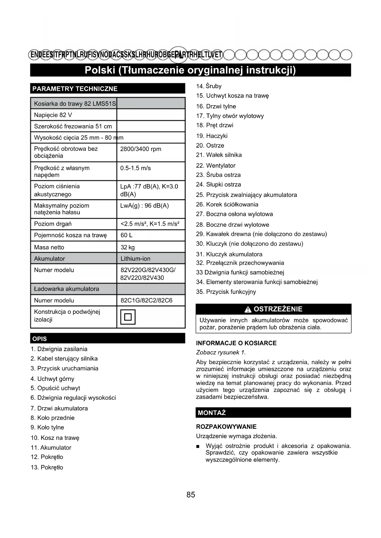 EN DE ES IT FR PT NL RU FI SV NO DA CS SK SL HR HU RO BG EL AR TR HE LT LV ET PARAMETRY TECHNICZNEKosiarka do trawy 82 LMS51SNapięcie 82 VSzerokość frezowania 51 cmWysokość cięcia 25 mm - 80 mmPrędkość obrotowa bez obciążenia2800/3400 rpmPrędkość z własnym napędem0.5-1.5 m/sPoziom ciśnienia akustycznegoLpA :77 dB(A), K=3.0 dB(A)Maksymalny poziom natężenia hałasuLwA(g) : 96 dB(A)Poziom drgań <2.5 m/s², K=1.5 m/s²Pojemność kosza na trawę 60 LMasa netto 32 kgAkumulator Lithium-ionNumer modelu 82V220G/82V430G/82V220/82V430Ładowarka akumulatoraNumer modelu 82C1G/82C2/82C6Konstrukcja o podwójnejizolacji OPIS 1. Dźwignia zasilania2. Kabel sterujący silnika3. Przycisk uruchamiania4. Uchwyt górny5. Opuścić uchwyt6. Dźwignia regulacji wysokości7. Drzwi akumulatora8. Koło przednie9. Koło tylne10. Kosz na trawę11. Akumulator12. Pokrętło13. Pokrętło Śruby15. Uchwyt kosza na trawę16. Drzwi tylne17. Tylny otwór wylotowy18. Pręt drzwi19. Haczyki20. Ostrze21. Wałek silnika22. Wentylator23. Śruba ostrza24. Słupki ostrza25. Przycisk zwalniający akumulatora26. Korek ściółkowania27. Boczna osłona wylotowa28. Boczne drzwi wylotowe29. Kawałek drewna (nie dołączono do zestawu)30. Kluczyk (nie dołączono do zestawu)31. Kluczyk akumulatora32. Przełącznik przechowywania33 Dźwignia funkcji samobieżnej 34. Elementy sterowania funkcji samobieżnej35. Przycisk funkcyjny OSTRZEŻENIE Używanie innych akumulatorów może spowodować pożar, porażenie prądem lub obrażenia ciała. INFORMACJE O KOSIARCEZobacz rysunek 1. Aby bezpiecznie korzystać z urządzenia, należy w pełni zrozumieć informacje umieszczone na urządzeniu oraz w niniejszej instrukcji obsługi oraz posiadać niezbędną wiedzę na temat planowanej pracy do wykonania. Przed użyciem tego urządzenia zapoznać się z obsługą i zasadami bezpieczeństwa.MONTAŻROZPAKOWYWANIEUrządzenie wymaga złożenia. ■ Wyjąć ostrożnie produkt i akcesoria z opakowania. Sprawdzić, czy opakowanie zawiera wszystkie wyszczególnione elementy. 85Polski (Tłumaczenie oryginalnej instrukcji)