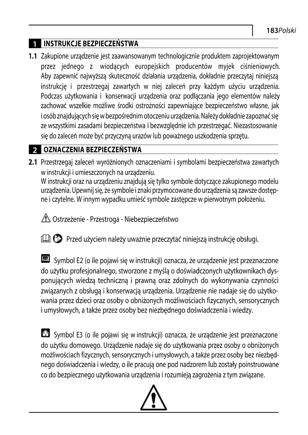 Przestrzegaj zaleceń wyróżnionych oznaczeniami i symbolami bezpieczeństwa zawartych w instrukcji i umieszczonych na urządzeniu. W instrukcji oraz na urządzeniu znajdują się tylko symbole dotyczące zakupionego modelu urządzenia. Upewnij się, że symbole i znaki przymocowane do urządzenia są zawsze dostęp- ne i czytelne. W innym wypadku umieść symbole zastępcze w pierwotnym położeniu. Ostrzeżenie - Przestroga - Niebezpieczeństwo Przed użyciem należy uważnie przeczytać niniejszą instrukcję obsługi. Symbol E2 (o ile pojawi się winstrukcji) oznacza, że urządzenie jest przeznaczone do użytku profesjonalnego, stworzone z myślą o doświadczonych użytkownikach dys- ponujących wiedzą techniczną i prawną oraz zdolnych do wykonywania czynności związanych z obsługą i konserwacją urządzenia. Urządzenie nie nadaje się do użytko- wania przez dzieci oraz osoby o obniżonych możliwościach fizycznych, sensorycznych i umysłowych, a także przez osoby bez niezbędnego doświadczenia i wiedzy. Symbol E3 (o ile pojawi się winstrukcji) oznacza, że urządzenie jest przeznaczone do użytku domowego. Urządzenie nadaje się do użytkowania przez osoby o obniżonych możliwościach fizycznych, sensorycznych i umysłowych, a także przez osoby bez niezbęd- nego doświadczenia i wiedzy, o ile pracują one pod nadzorem lub zostały poinstruowane co do bezpiecznego użytkowania urządzenia i rozumieją zagrożenia z tym związane.184 Polski Ruchome części. Nie dotykać. 0 Przełącznik w pozycji wyłączonej