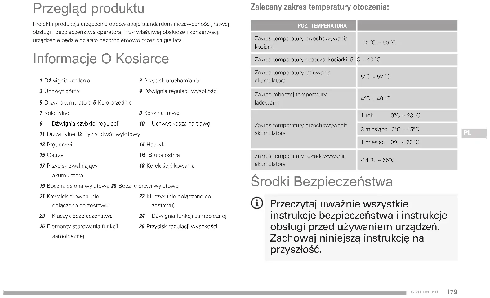 Przegląd produktu Projekt i produkcja urządzenia odpowiadają standardom niezawodności, łatwej obsługi i bezpieczeństwa operatora. Przy właściwej obsłudze i konserwacji urządzenie będzie działało bezproblemowo przez długie lata. Informacje O Kosiarce 1 Dźwignia zasilania2 Przycisk uruchamiania3 Uchwyt górny4 Dźwignia regulacji wysokości5 Drzwi akumulatora 6 Koło przednie7 Koło tylne8 Kosz na trawę 9 Dźwignia szybkiej regulacji 10 Uchwyt kosza na trawę 11 Drzwi tylne 12 Tylny otwór wylotowy13 Pręt drzwi14 Haczyki15 Ostrze16 Śruba ostrza17 Przycisk zwalniający akumulatora18 Korek ściółkowania19 Boczna osłona wylotowa 20 Boczne drzwi wylotowe21 Kawałek drewna (nie dołączono do zestawu)22 Kluczyk (nie dołączono do zestawu) 23 Kluczyk bezpieczeństwa 24 Dźwignia funkcji samobieżnej 25 Elementy sterowania funkcji samobieżnej26 Przycisk regulacji wysokości Zalecany zakres temperatury otoczenia: POZ. TEMPERATURA Zakres temperatury przechowywania kosiarki-10 ˚C ~ 60 ˚CZakres temperatury roboczej kosiarki -5 ˚C ~ 40 ˚CZakres temperatury ładowania akumulatora 5°C ~ 52 ˚CZakres roboczej temperatury ładowarki 4°C ~ 40 ˚CZakres temperatury przechowywania akumulatora 1 rok 0°C ~ 23 ˚C3 miesiące 0°C ~ 45°C1 miesiąc 0°C ~ 60 ˚CZakres temperatury rozładowywania akumulatora -14 ˚C ~ 65°C Środki Bezpieczeństwa Przeczytaj uważnie wszystkie instrukcje bezpieczeństwa i instrukcje obsługi przed używaniem urządzeń. Zachowaj niniejszą instrukcję na przyszłość.180 cramer.eu