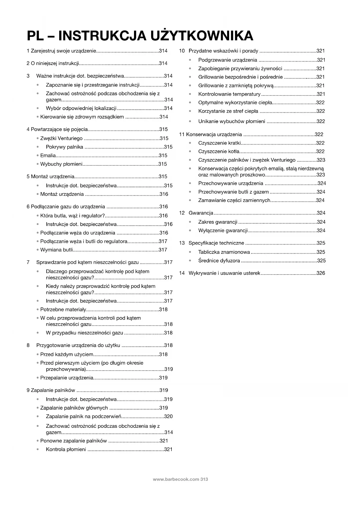 14 Wykrywanie i usuwanie usterek.......................................326 MAN_GAS_QUISSON_BBC_140730_A.book Page 313 Tuesday, February 2, 2016 4:55 PM314 www.barbecook.com 1 ZAREJESTRUJ SWOJE URZĄDZENIE Dziękujemy za zakup urządzeniaBarbecook! Mamy nadzieję, że dzięki niemu mile spędzą Państwo czas podczas grillowania. W celu zwiększenia satysfakcji z korzystania zarejestruj swoje urządzenie na stronie www.barbecook.com. Zajmie to zaledwie kilka minut i zapewni wiele korzyści: