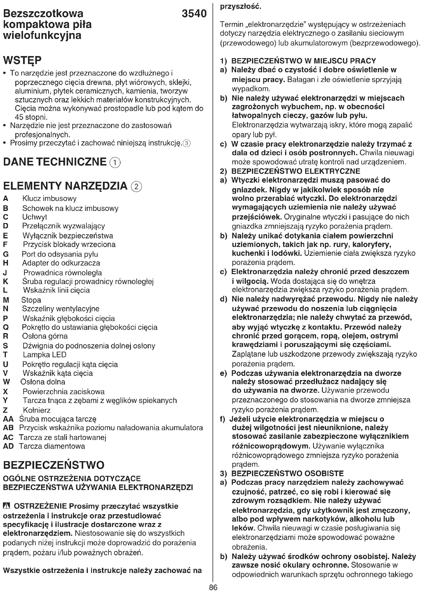 P Wskaźnik głębokości cięcia Q Pokrętło do ustawiania głębokości cięcia R Osłona górna S Dźwignia do podnoszenia dolnej osłony T Lampka LED U Pokrętło regulacji kąta cięcia V Wskaźnik kąta cięcia W Osłona dolna X Powierzchnia zaciskowa Y Tarcza tnąca z zębami z węglików spiekanych Z Kołnierz AA Śruba mocująca tarczę AB Przycisk wskaźnika poziomu naładowania akumulatora AC Tarcza ze stali hartowanej AD Tarcza diamentowa BEZPIECZEŃSTWO