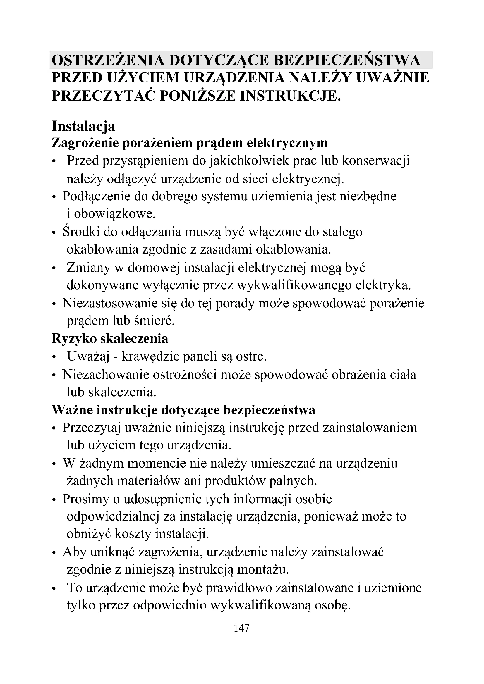 PRZED UŻYCIEM URZĄDZENIA NALEŻY UWAŻNIE PRZECZYTAĆ PONIŻSZE INSTRUKCJE. Instalacja Zagrożenie porażeniem prądem elektrycznym Przed przystąpieniem do jakichkolwiek prac lub konserwacji należy odłączyć urządzenie od sieci elektrycznej. Podłączenie do dobrego systemu uziemienia jest niezbędne i obowiązkowe. Środki do odłączania muszą być włączone do stałego okablowania zgodnie z zasadami okablowania. Zmiany w domowej instalacji elektrycznej mogą być dokonywane wyłącznie przez wykwalifikowanego elektryka. Niezastosowanie się do tej porady może spowodować porażenie prądem lub śmierć. Ryzyko skaleczenia Uważaj - krawędzie paneli są ostre. Niezachowanie ostrożności może spowodować obrażenia ciała lub skaleczenia. Ważne instrukcje dotyczące bezpieczeństwa Przeczytaj uważnie niniejszą instrukcję przed zainstalowaniem lub użyciem tego urządzenia. W żadnym momencie nie należy umieszczać na urządzeniu żadnych materiałów ani produktów palnych. Prosimy o udostępnienie tych informacji osobie odpowiedzialnej za instalację urządzenia, ponieważ może to obniżyć koszty instalacji. Aby uniknąć zagrożenia, urządzenie należy zainstalować zgodnie z niniejszą instrukcją montażu. To urządzenie może być prawidłowo zainstalowane i uziemione tylko przez odpowiednio wykwalifikowaną osobę.148 To urządzenie powinno być podłączone do obwodu zawierającego wyłącznik zapewniający pełne odłączenie od źródła zasilania. OSTRZEŻENIE: Należy korzystać wyłącznie z osłon płyty kuchennej zaprojektowanych przez producenta urządzenia lub wskazanych przez niego w instrukcji obsługi jako odpowiednie lub z osłon płyty kuchennej wbudowanych w urządzenie. Użycie nieodpowiednich osłon może być przyczyną wypadków. Nieprawidłowy montaż urządzenia może spowodować unieważnienie gwarancji lub roszczeń z tytułu odpowiedzialności. Szczegółowe informacje dotyczące instalacji można znaleźć w sekcji <Instalacja>. Obsługa i konserwacja Zagrożenie porażeniem prądem elektrycznym Nie gotuj na zepsutej lub pękniętej płycie kuchennej. Jeśli powierzchnia płyty kuchennej złamie się lub pęknie, natychmiast wyłącz urządzenie za pomocą zasilania sieciowego (wyłącznik ścienny) i skontaktuj się z wykwalifikowanym technikiem. Przed czyszczeniem lub konserwacją wyłącz płytę kuchenną przy ścianie. Niezastosowanie się do tej porady może spowodować porażenie prądem lub śmierć. Zagrożenie zdrowia To urządzenie spełnia normy bezpieczeństwa elektromagnetycznego. Zagrożenie gorącą powierzchnią Podczas użytkowania dostępne części tego urządzenia nagrzewają się na tyle, że mogą spowodować oparzenia. Nie pozwól, aby Twoje ciało, ubranie lub jakikolwiek przedmiot inny niż odpowiednie naczynia kuchenne stykały się ze szkłem ceramicznym, dopóki powierzchnia nie ostygnie.149 Metalowe przedmioty, takie jak noże, widelce, łyżki i pokrywki, nie powinny być umieszczane na powierzchni płyty, ponieważ mogą się nagrzać.4 Dzieci w wieku poniżej 8 lat nie powinny przebywać w pobliżu urządzenia, chyba że są pod stałym nadzorem. Uchwyty garnków mogą być gorące w dotyku. Sprawdź, czy uchwyty garnków nie wystają poza inne włączone pola grzejne. Trzymaj uchwyty poza zasięgiem dzieci. Niezastosowanie się do tej porady może spowodować oparzenia. Ryzyko skaleczenia Ostre jak brzytwa ostrze skrobaka do płyt kuchennych jest odsłonięte, gdy osłona bezpieczeństwa jest schowana. Używaj z najwyższą ostrożnością i zawsze przechowuj bezpiecznie i poza zasięgiem dzieci. Niezachowanie ostrożności może spowodować obrażenia ciała lub skaleczenia. Ważne instrukcje dotyczące bezpieczeństwa Nigdy nie pozostawiaj urządzenia bez nadzoru podczas użytkowania. Kipienie powoduje dymienie i tłuste wycieki, które mogą się zapalić. Nigdy nie używaj urządzenia jako powierzchni do pracy lub przechowywania. Nigdy nie zostawiaj żadnych przedmiotów ani przyborów na urządzeniu. Nigdy nie używaj urządzenia do ogrzewania lub ogrzewania pomieszczenia. Po użyciu zawsze wyłączaj pola grzejne i płytę grzejną zgodnie z opisem w niniejszej instrukcji (tj. za pomocą przycisków dotykowych). Nie należy polegać na funkcji wykrywania naczynia w celu wyłączenia stref gotowania po zdjęciu naczyń. Nie pozwalaj dzieciom bawić się urządzeniem, siadać, stać lub wspinać się po nim.150 Nie przechowuj przedmiotów interesujących dla dzieci w szafkach nad urządzeniem. Dzieci wchodzące na płytę kuchenną mogą odnieść poważne obrażenia. Nie zostawiaj dzieci samych lub bez opieki w obszarze, w którym jest używane urządzenie. Dzieci lub osoby z niepełnosprawnością, która ogranicza ich zdolność do obsługi urządzenia, powinny mieć odpowiedzialną i kompetentną osobę, która poinstruuje je w zakresie jego obsługi. Instruktor powinien mieć pewność, że może używać urządzenia bez zagrożenia dla siebie i swojego otoczenia. Nie naprawiaj ani nie wymieniaj żadnej części urządzenia, chyba że jest to wyraźnie zalecane w instrukcji. Wszystkie inne czynności serwisowe powinny być wykonywane przez wykwalifikowanego technika. Nie używaj myjki parowej do czyszczenia płyty grzewczej. Nie kładź ani nie upuszczaj ciężkich przedmiotów na płytę kuchenną. Nie stawaj na płycie kuchennej. Nie używaj garnków z nierównymi krawędziami ani nie przeciągaj naczyń po powierzchni szkła, ponieważ może to porysować szkło. Do czyszczenia płyty kuchennej nie używaj druciaków ani innych szorstkich środków czyszczących, ponieważ mogą one porysować szkło ceramiczne. Jeśli kabel zasilający ulegnie uszkodzeniu, dla bezpieczeństwa należy zlecić jego wymianę producentowi, autoryzowanemu serwisowi lub osobom o podobnych kwalifikacjach. To urządzenie jest przeznaczone wyłącznie do użytku w gospodarstwie domowym! Użytkowanie komercyjne nie