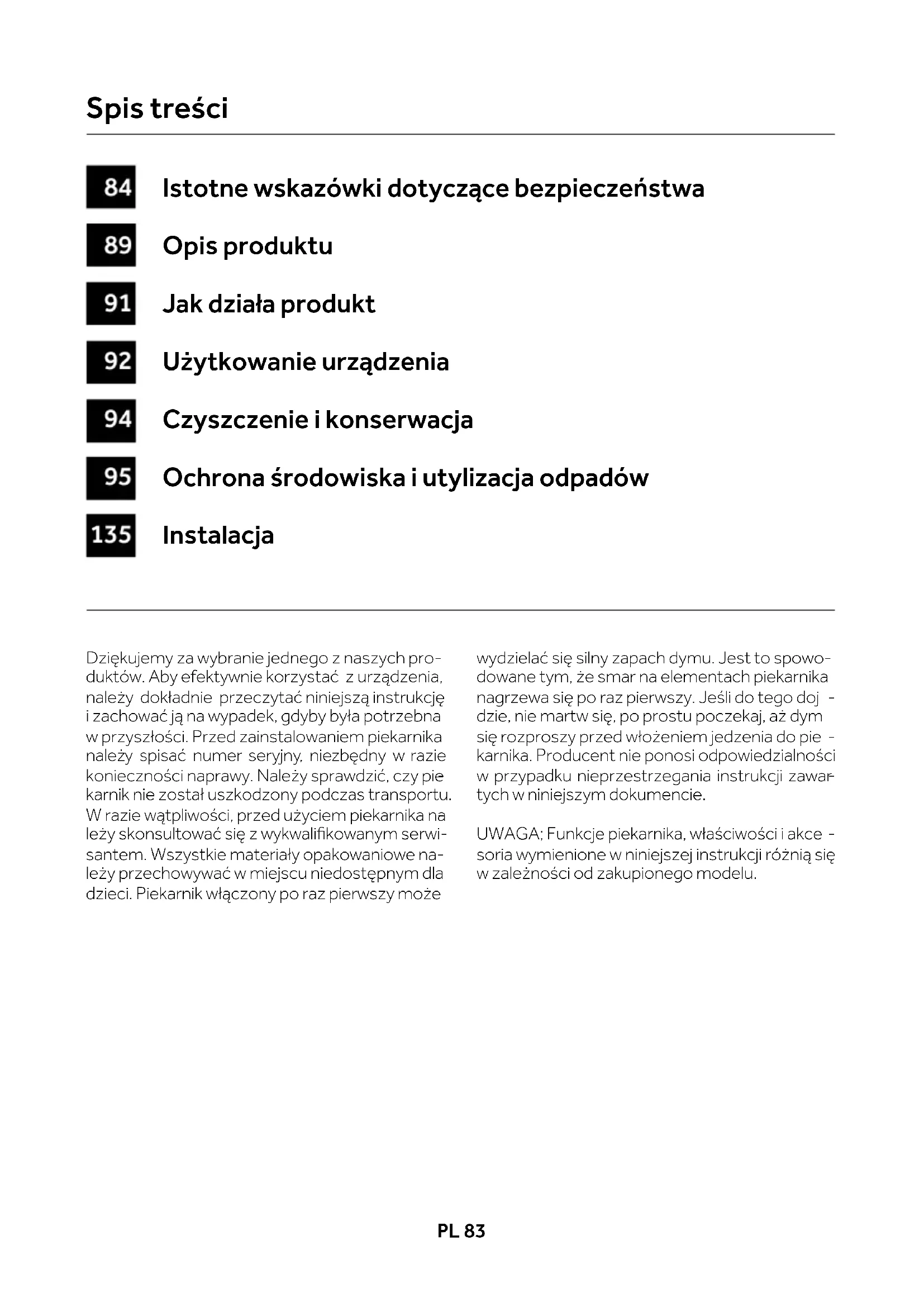 soria wymienione w niniejszej instrukcji różnią się w zależności od zakupionego modelu. Istotne wskazówki dotyczące bezpieczeństwa Opis produktu Jak działa produkt Użytkowanie urządzenia Czyszczenie i konserwacja Ochrona środowiska i utylizacja odpadów Instalacja
