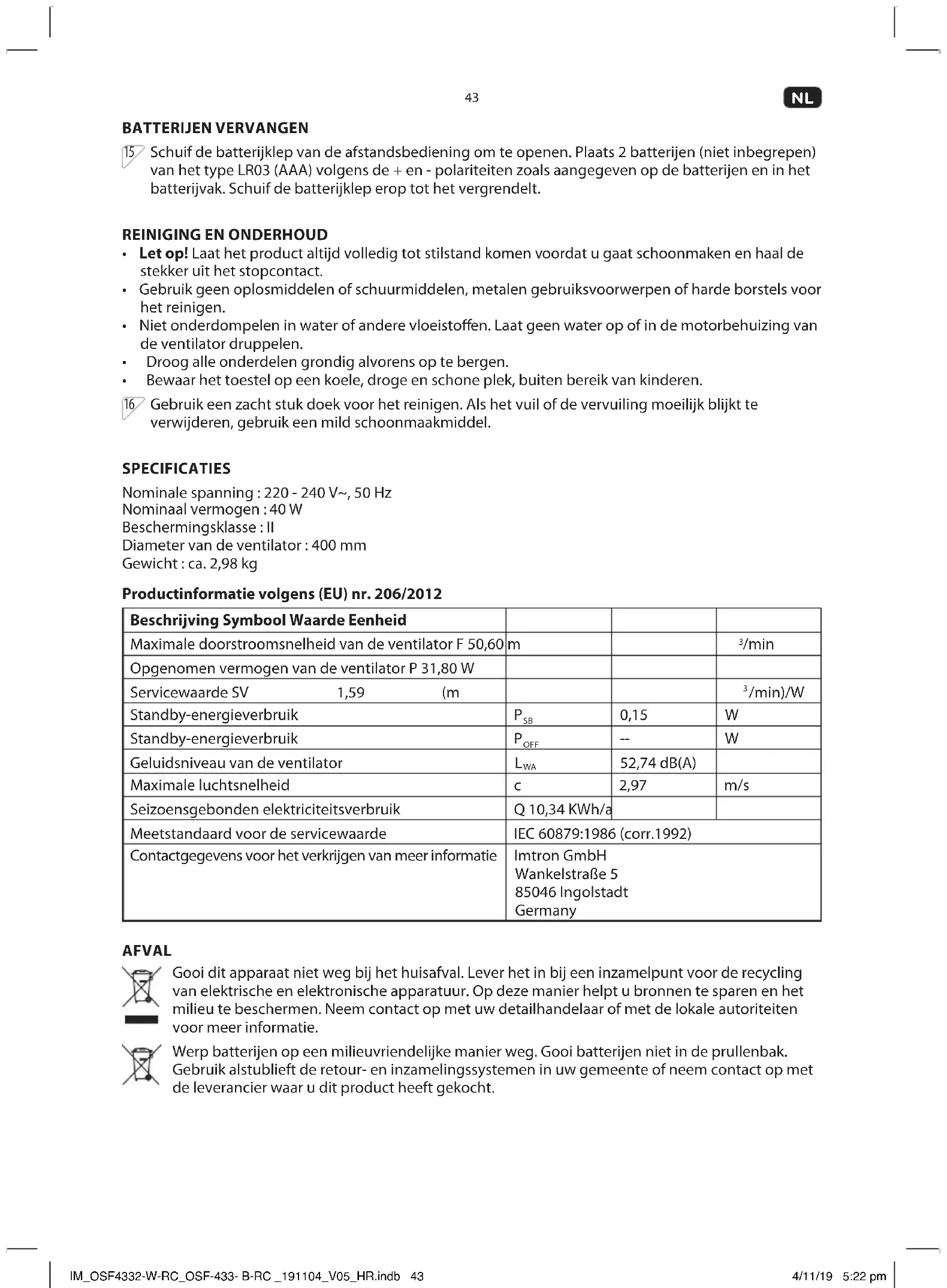 52,74 dB(A) Maksymalna prędkość powietrza c 2,97 m/s Sezonowe zużycie energii elektrycznej Q 10,34 KWh/a Standardy pomiaru wydajności w stosunku do pobieranej mocy IEC 60879:1986 (corr.1992) Dane kontaktowe w celu uzyskania więcej informacji Imtron GmbH Wankelstraße 5 85046 Ingolstadt Germany UTYLIZACJA Nie wyrzucać urządzenia do ogólnego domowego kosza na śmieci. Należy je oddać w specjalnym punkcie zbiórki elektrycznego i elektronicznego przeznaczonego do recyklingu. W ten sposób przyczynią się Państwo do redukcji zużycia zasobów oraz do ochrony środowiska. Aby uzyskać więcej informacji na ten temat, proszę skontaktować się ze sprzedawcą lub odpowiednim urzędem. Prosimy zutylizować baterie w sposób przyjazny dla środowiska. Nie wolno wyrzucać baterii wraz zinnymi odpadkami gospodarstwa domowego. W celu znalezienia odpowiedniego punktu zbiórki baterii należy skontaktować się ze sprzedawcą. IM_OSF4332-W-RC_OSF-433- B-RC _191104_V05_HR.indb 48 4/11/19 5:22 pm49