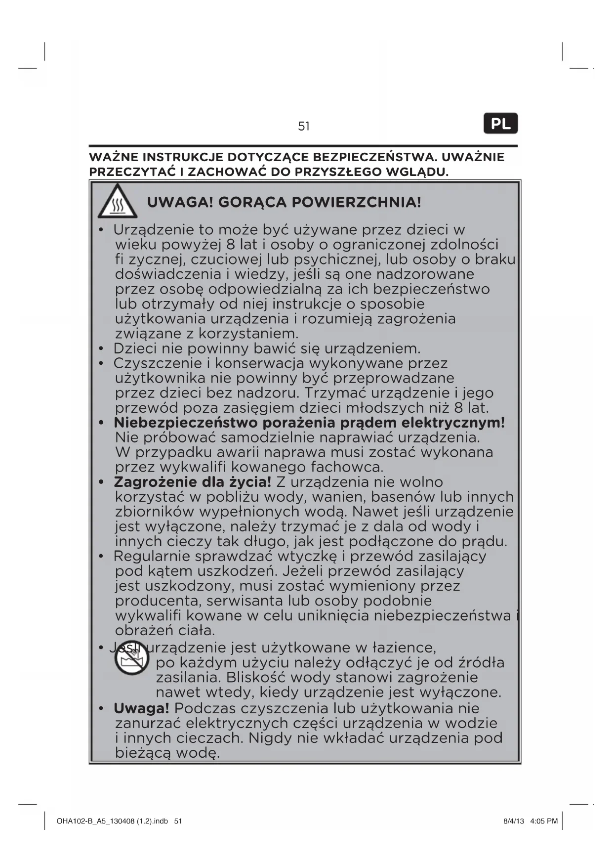 - Uwaga! Podczas czyszczenia lub użytkowania nie zanurzać elektrycznych części urządzenia w wodzie i innych cieczach. Nigdy nie wkładać urządzenia pod bieżącą wodę. OHA102-B_A5_130408 (1.2).indb 51OHA102-B_A5_130408 (1.2).indb 51 8/4/13 4:05 PM8/4/13 4:05 PM52
