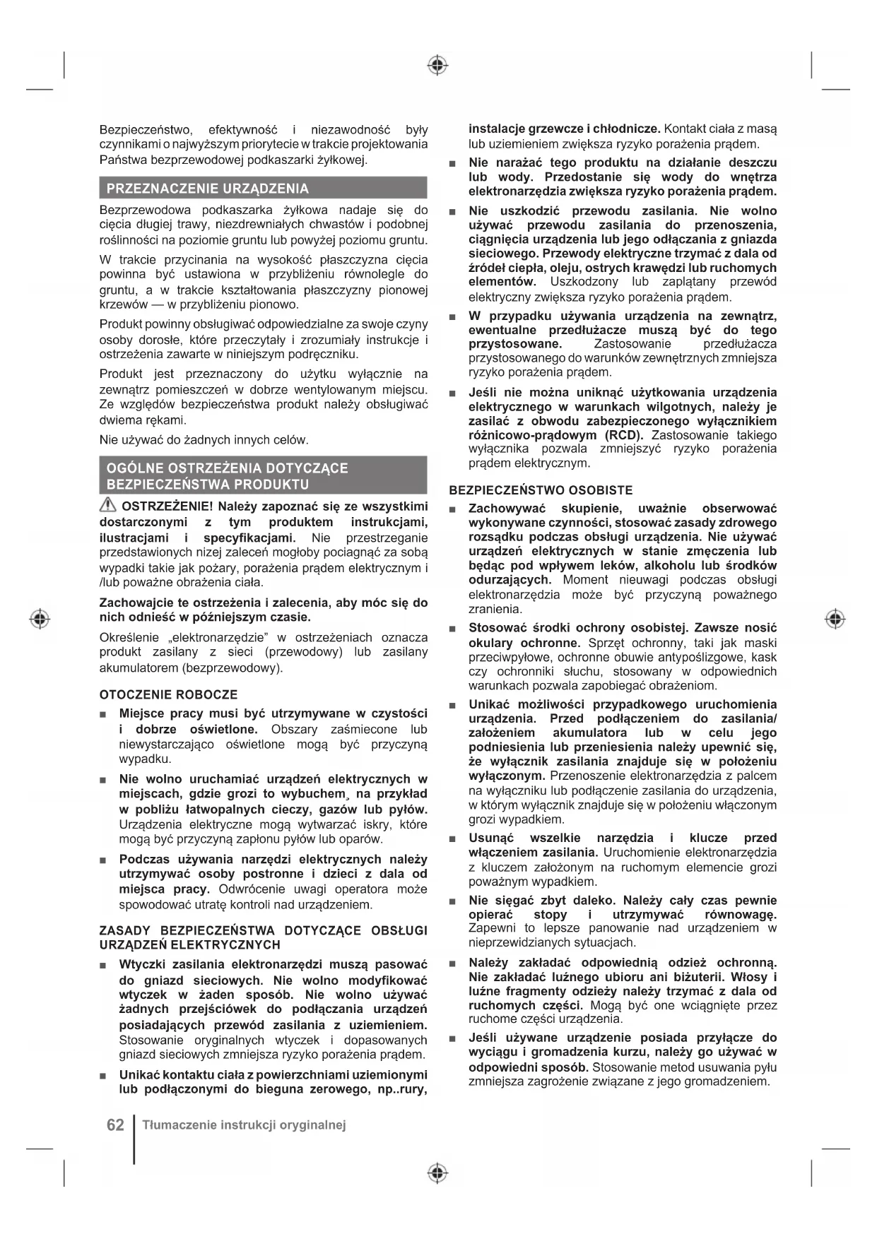 ■ Nie należy używać urządzenia w niekorzystnych warunkach atmosferycznych, zwłaszcza gdy istnieje ryzyko uderzenia pioruna. Zmniejsza to ryzyko porażenia piorunem. ■ Należy dokładnie sprawdzić, czy na obszarze, na którym ma być używane urządzenie, nie ma dzikich zwierząt. Dzikie zwierzęta mogą zostać zranione przez urządzenie podczas pracy. ■ Dokładnie sprawdzić obszar, na którym ma być używane urządzenie, i usunąć wszelkie kamienie, patyki, druty, kości i inne przedmioty. Miotane przedmioty mogą spowodować obrażenia. ■ Przed użyciem urządzenia należy zawsze przeprowadzić jego oględziny, aby upewnić się, czy obcinak lub ostrze oraz zespół obcinaka i zespół koszący nie są zużyte lub uszkodzone. Uszkodzone części zwiększają ryzyko obrażeń. ■ Należy przestrzegać instrukcji dotyczących wymiany akcesoriów. Nieprawidłowo dokręcone nakrętki lub śruby mocujące ostrze mogą spowodować jego uszkodzenie lub odseparowanie.64 Tłumaczenie instrukcji oryginalnej ■ Stosować środki ochrony oczu, uszu, głowy i dłoni. Odpowiedni sprzęt ochronny zmniejsza ryzyko urazów ciała powodowanych przez latające odłamki lub przypadkowy kontakt z żyłką tnącą lub ostrzem. ■ W trakcie obsługi urządzenia należy zawsze nosić antypoślizgowe obuwie ochronne. Nie wolno obsługiwać urządzenia będąc boso, lub mając założone lekkie obuwie typu sandały. Zmniejsza to prawdopodobieństwo obrażeń stóp w wyniku kontaktu z ruchomymi obcinakami lub żyłkami. ■ Podczas obsługi urządzenia należy zawsze nosić długie spodnie. Odsłonięta skóra zwiększa prawdopodobieństwo zranienia przez miotane przedmioty. ■ Urządzenia należy używać z dala od osób postronnych. Wyrzucane pozostałości mogą spowodować poważne obrażenia. ■ Podczas obsługi urządzenia należy zawsze używać obu rąk. Trzymanie urządzenia obiema rękami pozwoli uniknąć utraty kontroli. ■ Urządzenie należy trzymać wyłącznie za izolowane powierzchnie chwytne, ponieważ w przeciwnym przypadku żyłka tnąca lub ostrze może zetknąć się z ukrytymi przewodami. Zetknięcie się żyłki tnącej lub ostrzy z przewodem pod napięciem może spowodować, że odsłonięte metalowe części urządzenia również znajdą się pod napięciem, co może skutkować porażeniem prądem elektrycznym. ■ Należy zawsze dbać o prawidłowe oparcie stóp i obsługiwać urządzenie wyłącznie stojąc na gruncie. Śliskie i niestabilne powierzchnie mogą doprowadzić do utraty równowagi lub kontroli nad urządzeniem. ■ Nie używać urządzenia na zbyt stromych zboczach. Zmniejsza to ryzyko utraty kontroli, poślizgnięcia się i upadku, mogących prowadzić do powstania obrażeń. ■ Podczas pracy na zboczach należy zawsze upewniać się, że stoi się na stabilnym gruncie, zawsze kosić w poprzek zbocza, a nigdy w górę lub w dół, zaś podczas zmiany kierunku zachowywać szczególną ostrożność. Zmniejsza to ryzyko utraty kontroli, poślizgnięcia się i upadku, mogących prowadzić do powstania obrażeń. ■ Podczas pracy urządzenia należy trzymać wszystkie części ciała z dala od obcinaka, żyłki lub ostrza. Przed uruchomieniem urządzenia należy upewnić się, że obcinak, żyłka lub ostrze z niczym się nie stykają. Chwila nieuwagi podczas obsługi maszyny może spowodować obrażenia ciała zarówno u operatora, jak i u innych osób. ■ W trakcie pracy z urządzeniem nie należy trzymać go powyżej pasa. Zapobiega to niezamierzonemu dotknięciu obcinaka lub ostrza i umożliwia lepszą kontrolę nad urządzeniem w nieoczekiwanych sytuacjach. ■ Podczas ścinania naprężonych krzewów lub drzewek należy uważać na przemieszczające się pnie i gałęzie. Gdy napięcie drewna zostanie uwolnione, krzew lub drzewko może uderzyć operatora i/lub spowodować utratę kontroli nad urządzeniem. ■ Należy zachować szczególną ostrożność podczas cięcia krzaków i młodych drzew. Ostrze może złączyć się ze smukłymi łodygami, czego skutkiem może być wyrzucenie ich w stronę operatora lub wytrącenie go z równowagi. ■ Należy utrzymywać kontrolę nad urządzeniem i nie dotykać ostrzy ani innych niebezpiecznych ruchomych części, gdy znajdują się one w ruchu. Zmniejsza to ryzyko obrażeń spowodowanych przez ruchome części. ■ W czasie przenoszenia urządzenie powinno być wyłączone i trzymane z dala od ciała. Właściwa obsługa urządzenia zmniejszy prawdopodobieństwo przypadkowego kontaktu z ruchomym obcinakiem, żyłką lub ostrzem. ■ Jako części zamienne należy stosować wyłącznie obcinaki, żyłki, głowice tnące i ostrza określone przez producenta. Nieprawidłowe części zamienne mogą zwiększyć ryzyko awarii i obrażeń. ■ Podczas usuwania zakleszczonego materiału lub serwisowania urządzenia należy upewnić się, że wyłącznik jest ustawiony w położeniu oznaczającym wyłączenie, a akumulator jest wymontowany lub odłączony. Nieoczekiwane uruchomienie urządzenia podczas usuwania zakleszczonego materiału lub serwisowania może spowodować poważne obrażenia ciała.