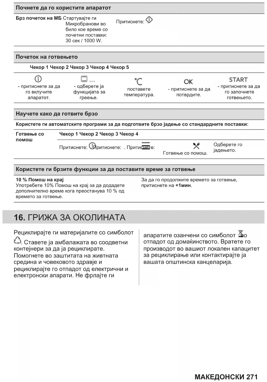 Rozpoczęcie korzystania z urządzenia Szybkie urucho‐ mienie Włączanie urządze‐ nia i rozpoczęcie pie‐ czenia z domyślnymi ustawieniami tempe‐ ratury i czasu dla da‐ nej funkcji. Krok 1 Krok 2 Krok 3 Nacisnąć i przytrzy‐ mać: . — wybrać preferowaną funkcję. Nacisnąć: . Szybkie wyłączenie Wyłączanie urządze‐ nia, dowolnego ekra‐ nu lub komunikatu w dowolnym momen‐ cie. - naciśnij i przytrzymaj, aż urządzenie wyłączy się. Szybkie urucho‐ mienie MW Uruchomienie w do‐ wolnej chwili funkcji kuchenki mikrofalo‐ wej z domyślnymi ustawieniami: 30 sek / 1000 W. Nacisnąć: . Rozpoczęcie pieczenia Krok 1 Krok 2 Krok 3 Krok 4 Krok 5 - nacisnąć, aby włą‐ czyć urządzenie. - wybrać funkcję pie‐ czenia. - ustawić temperatu‐ rę / . - nacisnąć, aby po‐ twierdzić. - nacisnąć, aby roz‐ począć pieczenie. Jak szybko przyrządzać potrawy Zaleca się korzystanie z programów automatycznych, aby szybko przyrządzać potrawy z wykorzysta‐ niem domyślnych ustawień: 298 POLSKIJak szybko przyrządzać potrawy Gotowanie wspomagane Krok 1 Krok 2 Krok 3 Krok 4 Nacisnąć: . Nacisnąć: . Nacisnąć: Goto‐ wanie wspomagane. Wybrać potrawę. Korzystanie z szybkich funkcji do ustawienia czasu pieczenia 10% — wykończenie potrawy Funkcja 10% — wykończenie potrawy umożliwia wydłu‐ żenie czasu pieczenia, gdy do zakończenia pieczenia pozostało 10% ustawionego czasu. Aby wydłużyć czas pieczenia, należy nacisnąć +1min.