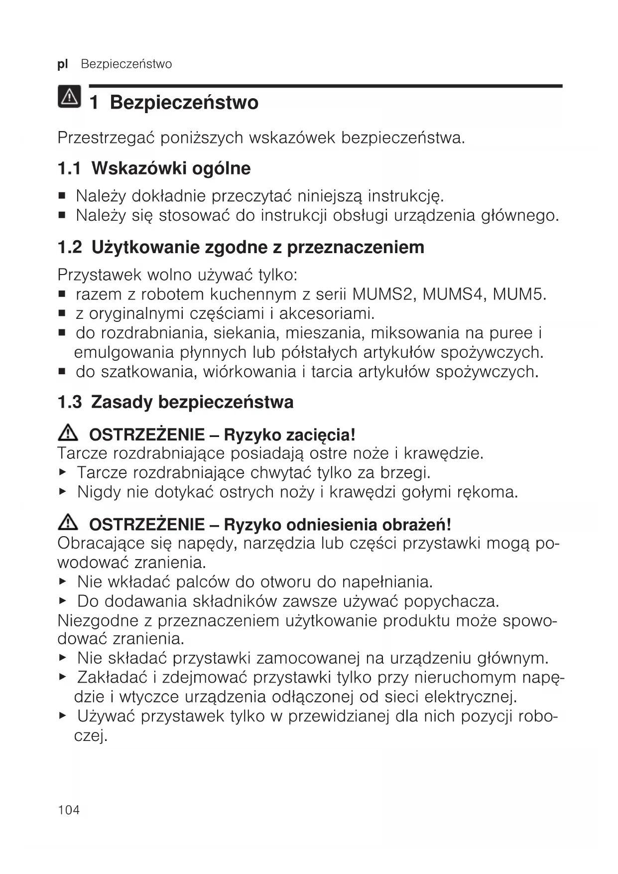 1 Bezpieczeństwo Przestrzegać poniższych wskazówek bezpieczeństwa. 1.1 Wskazówki ogólne ¡ Należy dokładnie przeczytać niniejszą instrukcję. ¡ Należy się stosować do instrukcji obsługi urządzenia głównego. 1.2 Użytkowanie zgodne zprzeznaczeniem Przystawek wolno używać tylko: ¡ razem z robotem kuchennym z serii MUMS2, MUMS4, MUM5. ¡ zoryginalnymi częściami iakcesoriami. ¡ do rozdrabniania, siekania, mieszania, miksowania na puree i emulgowania płynnych lub półstałych artykułów spożywczych. ¡ do szatkowania, wiórkowania i tarcia artykułów spożywczych. 1.3 Zasady bezpieczeństwa OSTRZEŻENIE‒Ryzyko zacięcia! Tarcze rozdrabniające posiadają ostre noże ikrawędzie. ▶ Tarcze rozdrabniające chwytać tylko za brzegi. ▶ Nigdy nie dotykać ostrych noży i krawędzi gołymi rękoma. OSTRZEŻENIE‒Ryzyko odniesienia obrażeń! Obracające się napędy, narzędzia lub części przystawki mogą po- wodować zranienia. ▶ Nie wkładać palców do otworu do napełniania. ▶ Do dodawania składników zawsze używać popychacza. Niezgodne z przeznaczeniem użytkowanie produktu może spowo- dować zranienia. ▶ Nie składać przystawki zamocowanej na urządzeniu głównym. ▶ Zakładać i zdejmować przystawki tylko przy nieruchomym napę- dzie i wtyczce urządzenia odłączonej od sieci elektrycznej. ▶ Używać przystawek tylko wprzewidzianej dla nich pozycji robo- czej.Zapobieganie szkodom materialnym pl