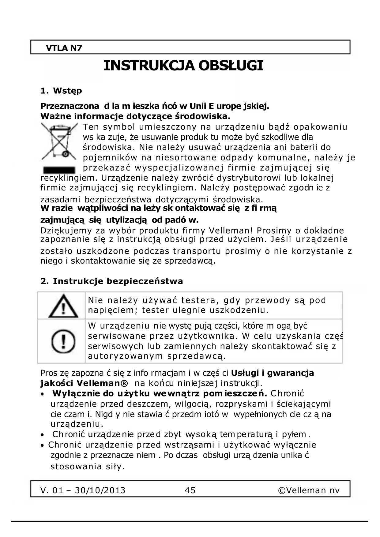 - Produkt nie podlega naprawie gwarancyjnej: - gdy wszystkie bezpośrednie lub pośrednie szkody spowodowane są działaniem czynników środowiskowych lub losowych (np.przez utlenianie, wstrząsy, upadki, kurz, brud, ...), wilgotności; - gwarant nie ponosi odpowiedzialności za szkody wynikających z utraty danych; - produkty konsumenckie, części zamienne lub akcesoria podatne na process starzenia, wynikającego z normalnego użytkowania, np: baterie (ładowalne, nieładowalne, wbudowane lub wymienne), żarówki, paski napędowe, gumowe elementy napędowe... (nieograniczona lista); - usterka wynika z działania pożaru, zalania wszelkimi cieczami, uderzenia pioruna, upadku lub klęski żywiołowej, itp.; - usterka wynika z zaniedbań eksploatacyjnych tj. umyślne bądź nieumyślne zaniechanie czyszczenia, konserwacji, wymiany materiałów ekspolatacyjnych, niedbalstwa lub z niewłaściwego obchodzenia się lub niezgodnego użytkowania z instrukcją producenta; - szkody wynikające z nadmiernego użytkowania gdy nie jest do tego celu przeznaczony tj. działalność komerycjna, zawodowa lub wspólne użytkowanie przez wiele osób - okres obowiązywania gwarancji zostanie obniżony do 6 (sześć) miesięcy; - Szkody wynikające ze źle zabezpieczonej wysyłki produktu; - Wszelkie szkody spowodowane przez nieautoryzowaną naprawę, modyfikację, przeróbkę produktu przez osoby trzecie jak również bez pisemnej zgody firmy Velleman
