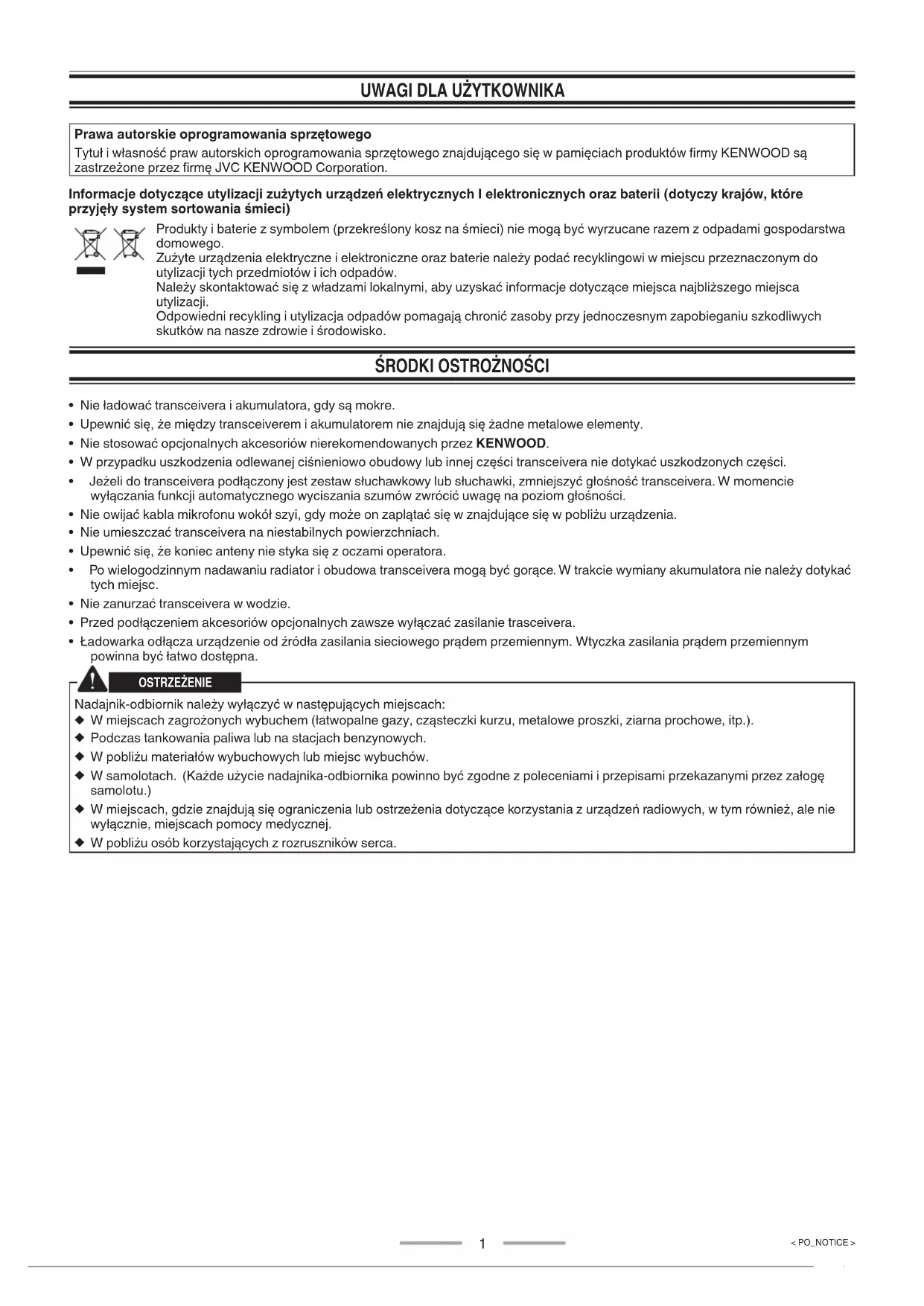 Prawa autorskie oprogramowania sprzętowego Tytuł i własność praw autorskich oprogramowania sprzętowego znajdującego się w pamięciach produktów firmy KENWOOD są zastrzeżone przez firmę JVC KENWOOD Corporation. Informacje dotyczące utylizacji zużytych urządzeń elektrycznych I elektronicznych oraz baterii (dotyczy krajów, które przyjęły system sortowania śmieci) Produkty i baterie z symbolem (przekreślony kosz na śmieci) nie mogą być wyrzucane razem z odpadami gospodarstwa domowego. Zużyte urządzenia elektryczne i elektroniczne oraz baterie należy podać recyklingowi w miejscu przeznaczonym do utylizacji tych przedmiotów i ich odpadów. Należy skontaktować się z władzami lokalnymi, aby uzyskać informacje dotyczące miejsca najbliższego miejsca utylizacji. Odpowiedni recykling i utylizacja odpadów pomagają chronić zasoby przy jednoczesnym zapobieganiu szkodliwych skutków na nasze zdrowie i środowisko.
