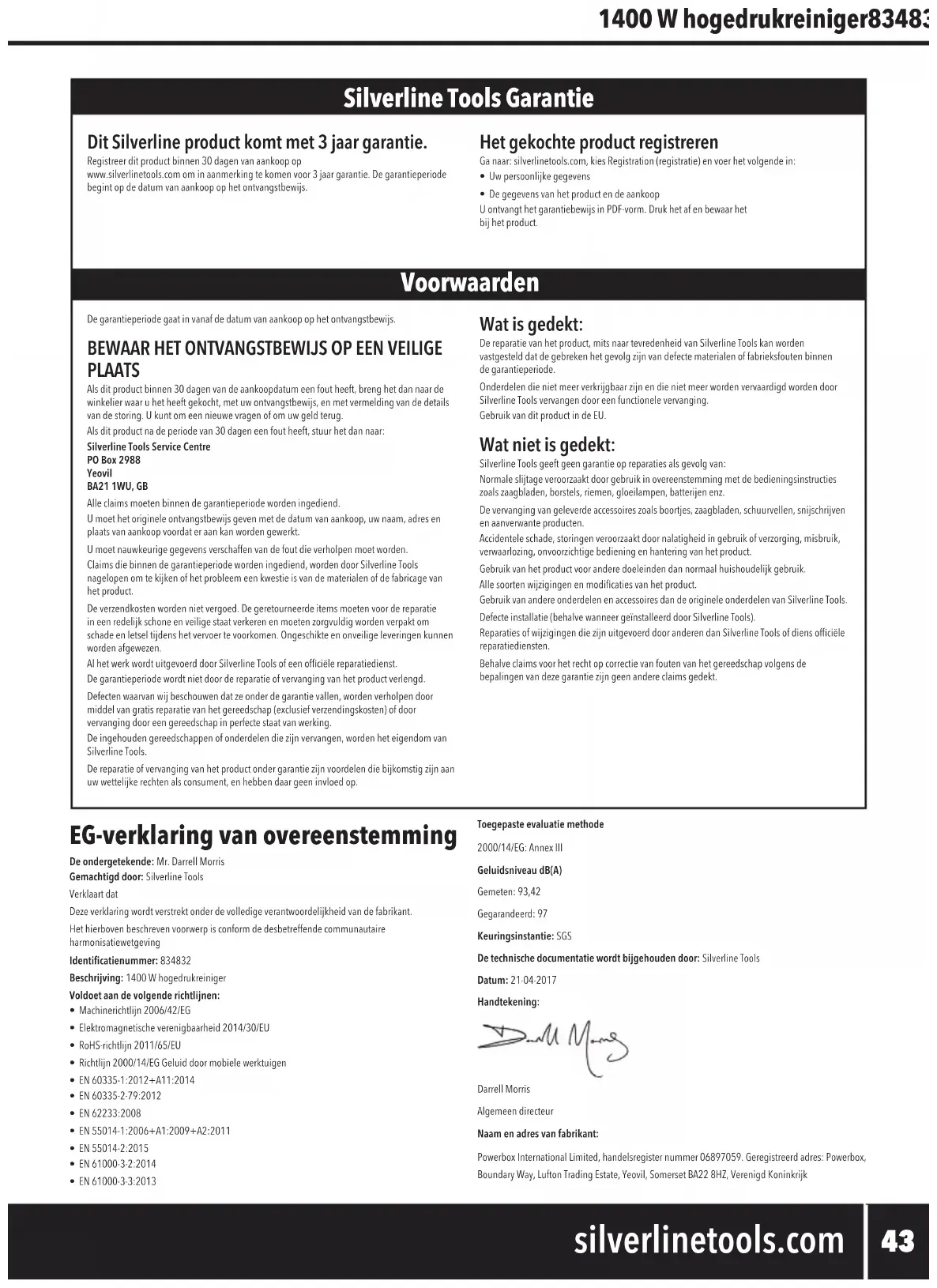 silverlinetools.com Zastosowana metoda oceny zgodności2000/14/EC: Anneks IIIPoziom mocy akustycznej dB (A)Mierzony: 93.42Gwarantowany: 97Zastosowana dyrektywa oceny zgodności: SGSDokumentacja techniczna produktu znajduje się w posiadaniu:SilverlineData: 21/04/2017Podpis: Mr Darrell MorrisDyrektor naczelnyNazwa i adres producenta:Powerbox International Limited, Company No. 06897059. Registered address: Powerbox, Boundary Way,LuftonTradingEstate,Yeovil,SomersetBA228HZ,UnitedKingdom. Zasady i warunki Gwarancja narzędzi Silverline Niniejszy produkt Silverline posiada 3 letnią gwarancję Abyzakwalikowaćsiędouzyskaniapowyższejgwarancjinależyzarejestrowaćniniejszyproduktnastroniewww.silverlinetools.comwciągu30dnioddatyzakupu.Okresgwarancjirozpoczynasięwdniuzakupuproduktuwidocznymnaparagonie. Rejestracja produktu Rejestracjiproduktumożnadokonaćnastroniewww.silverlinetools.com,wybierającprzycisk„Rejestracja”.Należywprowadzić:• Dane osobowe• SzczegółydotycząceproduktuorazinformacjedotyczącezakupuPowprowadzeniutychinformacjizostanieutworzonycertykatgwarancjininiejszegoproduktu,jakodokumentwformaciePDF,którynależywydrukowaćizachowaćwrazzdowodemzakupu.Okresgwarancjizaczynaobowiązywaćoddatyzakupudetalicznegoznajdującejsięnaparagonie.