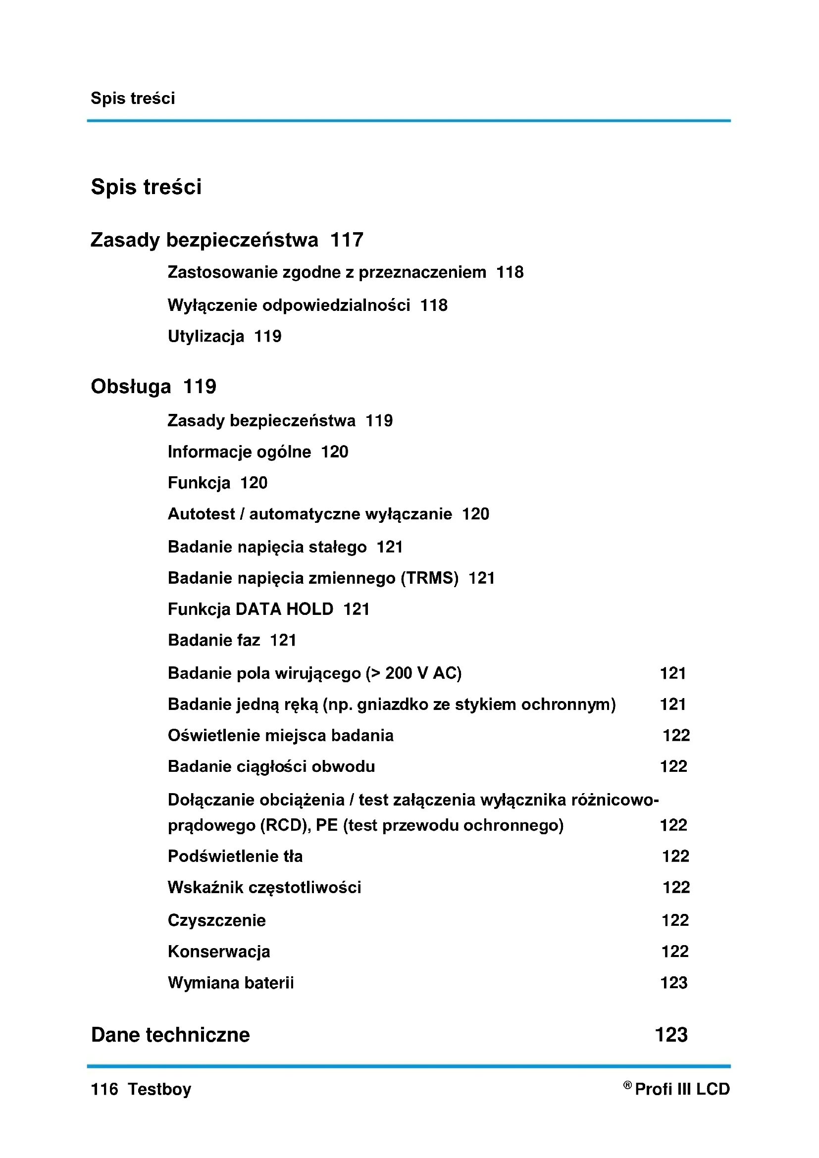 Profi III LCD Spis treści Zasady bezpieczeństwa 117 Zastosowanie zgodne z przeznaczeniem 118 Wyłączenie odpowiedzialności 118 Utylizacja 119 Obsługa 119 Zasady bezpieczeństwa 119 Informacje ogólne 120 Funkcja 120 Autotest / automatyczne wyłączanie 120 Badanie napięcia stałego 121 Badanie napięcia zmiennego (TRMS) 121 Funkcja DATA HOLD 121 Badanie faz 121 Badanie pola wirującego (> 200 V AC) 121 Badanie jedną ręką (np. gniazdko ze stykiem ochronnym) 121 Oświetlenie miejsca badania 122 Badanie ciągłości obwodu 122 Dołączanie obciążenia / test załączenia wyłącznika różnicowo- prądowego (RCD), PE (test przewodu ochronnego) 122 Podświetlenie tła 122 Wskaźnik częstotliwości 122 Czyszczenie 122 Konserwacja 122 Wymiana baterii 123 Dane techniczne 123Zasady bezpieczeństwa Testboy