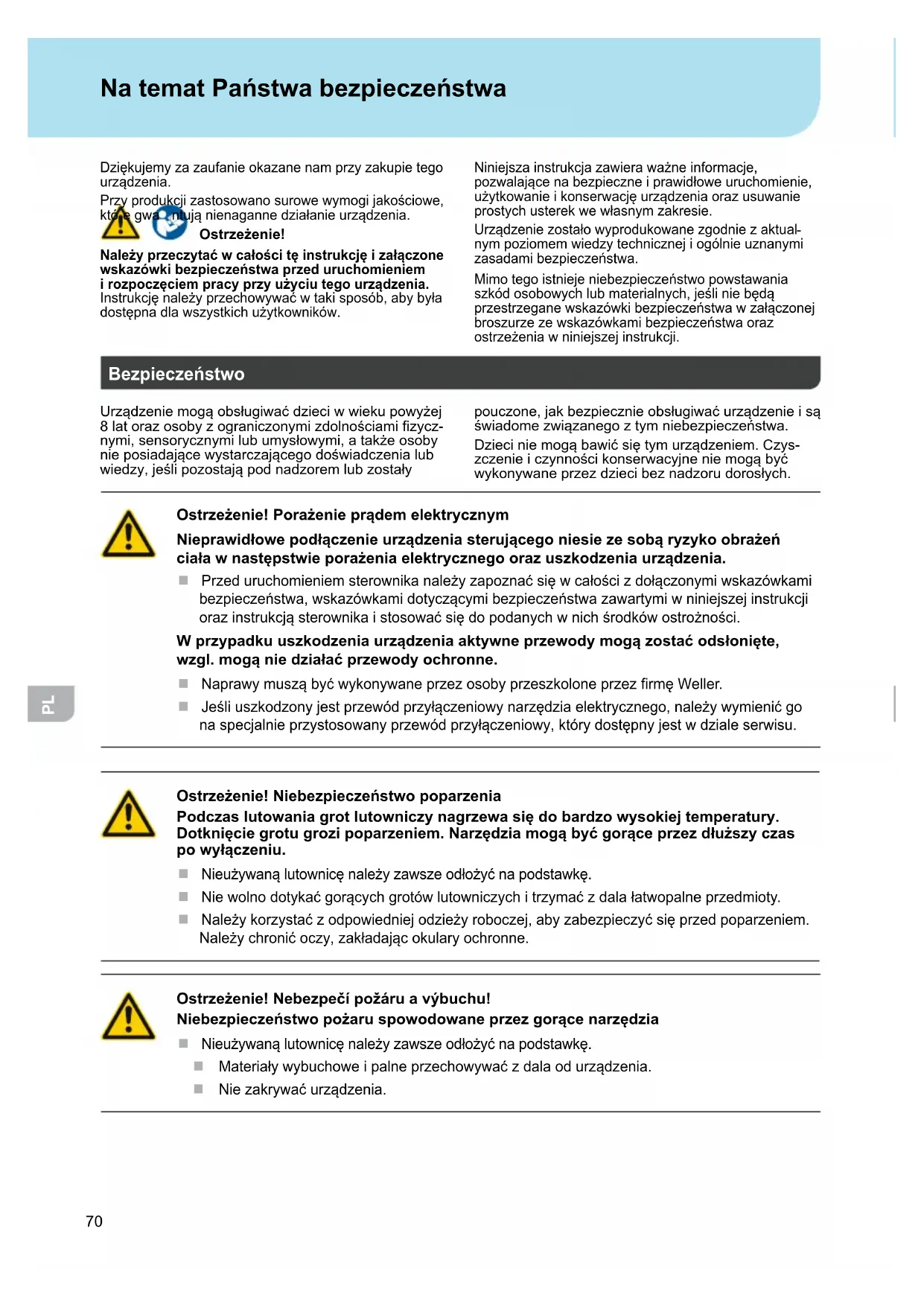 nympoziomemwiedzytechnicznejiogólnieuznanymi zasadamibezpieczeństwa. Mimotegoistniejeniebezpieczeństwopowstawania szkódosobowychlubmaterialnych,jeśliniebędą przestrzeganewskazówkibezpieczeństwawzałączonej broszurzezewskazówkamibezpieczeństwaoraz ostrzeżeniawniniejszejinstrukcji. Bezpieczeństwo Urządzeniemogąobsługiwaćdzieciwwiekupowyżej 8latorazosobyzograniczonymizdolnościamizycz- nymi,sensorycznymilubumysłowymi,atakżeosoby nieposiadającewystarczającegodoświadczenialub wiedzy,jeślipozostająpodnadzoremlubzostały pouczone,jakbezpiecznieobsługiwaćurządzenieisą świadomezwiązanegoztymniebezpieczeństwa. Dzieciniemogąbawićsiętymurządzeniem.Czys- zczenieiczynnościkonserwacyjneniemogąbyć wykonywaneprzezdziecibeznadzorudorosłych. Ostrzeenie! Poraenie prądem elektrycznym Nieprawidłowe podłączenie urządzenia sterującego niesie ze sobą ryzyko obraeń ciała w następstwie poraenia elektrycznego oraz uszkodzenia urządzenia. Przeduruchomieniemsterownikanależyzapoznaćsięwcałościzdołączonymiwskazówkami bezpieczeństwa,wskazówkamidotyczącymibezpieczeństwazawartymiwniniejszejinstrukcji orazinstrukcjąsterownikaistosowaćsiędopodanychwnichśrodkówostrożności. W przypadku uszkodzenia urządzenia aktywne przewody mogą zostać odsłonięte, wzgl. mogą nie działać przewody ochronne. NaprawymusząbyćwykonywaneprzezosobyprzeszkoloneprzezrmęWeller. Jeśliuszkodzonyjestprzewódprzyłączeniowynarzędziaelektrycznego,należywymienićgo naspecjalnieprzystosowanyprzewódprzyłączeniowy,którydostępnyjestwdzialeserwisu. Ostrzeenie! Niebezpieczeństwo poparzenia Podczas lutowania grot lutowniczy nagrzewa się do bardzo wysokiej temperatury. Dotknięcie grotu grozi poparzeniem. Narzędzia mogą być gorące przez dłuszy czas po wyłączeniu. Nieużywanąlutownicęnależyzawszeodłożyćnapodstawkę. Niewolnodotykaćgorącychgrotówlutowniczychitrzymaćzdalałatwopalneprzedmioty. Należykorzystaćzodpowiedniejodzieżyroboczej,abyzabezpieczyćsięprzedpoparzeniem. Należychronićoczy,zakładającokularyochronne. Ostrzeenie! Nebezpečí požáru a výbuchu! Niebezpieczeństwo poaru spowodowane przez gorące narzędzia Nieużywanąlutownicęnależyzawszeodłożyćnapodstawkę. Materiaływybuchoweipalneprzechowywaćzdalaodurządzenia. Niezakrywaćurządzenia.71