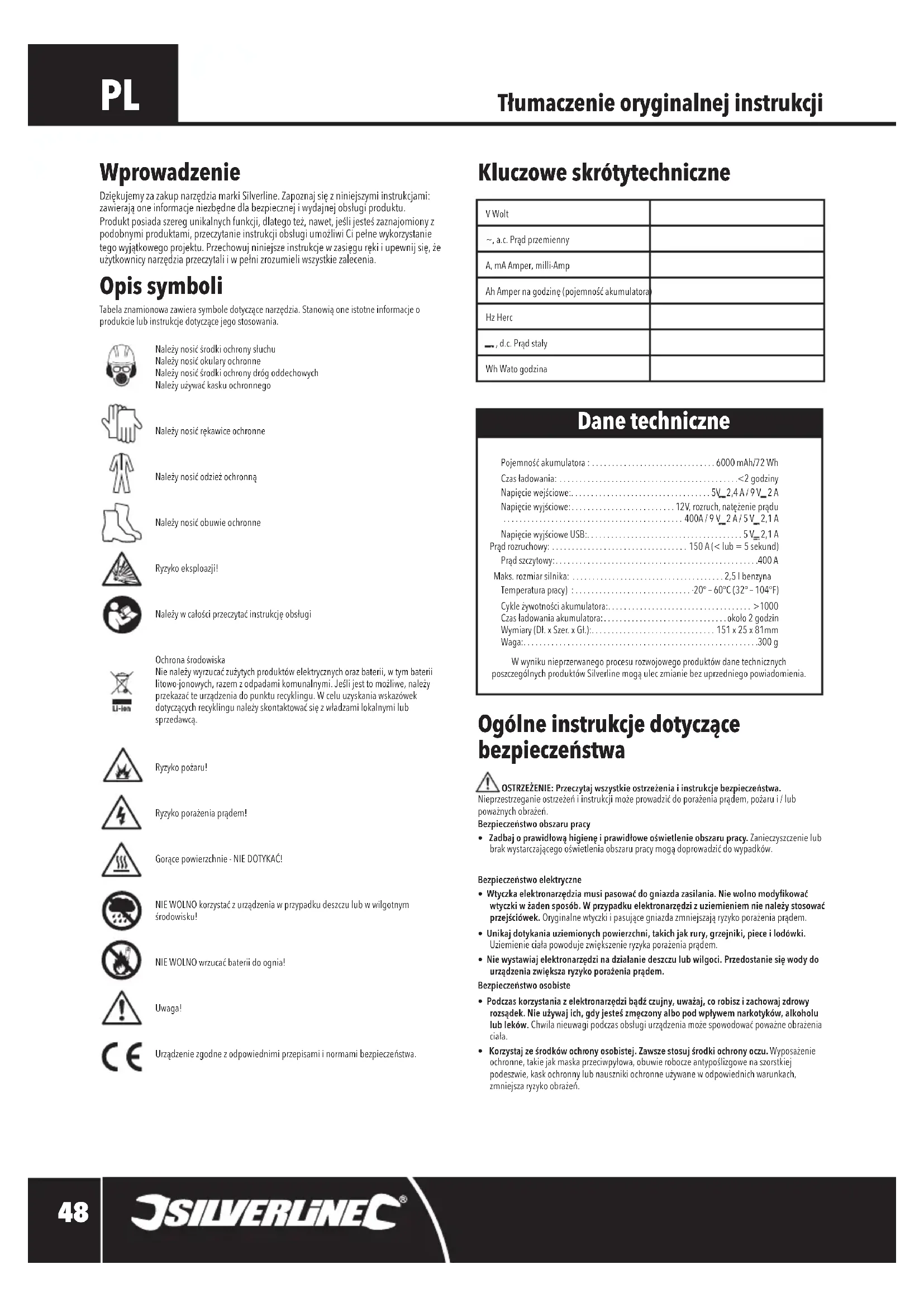 Pojemnośćakumulatora: ...............................6000 mAh/72 Wh Czasładowania: .............................................<2 godziny Napięciewejściowe:...................................5V 2,4 A / 9 V 2 A Napięciewyjściowe:..........................12V,rozruch,natężenieprądu .............................................400A / 9 V 2 A / 5 V 2,1 A NapięciewyjścioweUSB:.......................................5 V 2,1 A Prądrozruchowy: ..................................150 A (< lub = 5 sekund) Prądszczytowy:...................................................400 A Maks. rozmiar silnika: ......................................2,5 l benzyna Temperatura pracy) : . . . . . . . . . . . . . . . . . . . . . . . . . . . . . -20° – 60°C (32° – 104°F) Cykleżywotnościakumulatora:....................................>1000 Czasładowaniaakumulatora:...............................około2godzin Wymiary(Dł.xSzer.xGł.):...............................151 x 25 x 81mm Waga:...........................................................300 g W wyniku nieprzerwanego procesu rozwojowego produktów dane technicznych poszczególnychproduktówSilverlinemogąuleczmianiebezuprzedniegopowiadomienia. Dane techniczne Ogólne instrukcje dotyczące bezpieczeństwa OSTRZEŻENIE: Przeczytaj wszystkie ostrzeżenia i instrukcje bezpieczeństwa. Nieprzestrzeganieostrzeżeńiinstrukcjimożeprowadzićdoporażeniaprądem,pożarui/lubpoważnychobrażeń. Bezpieczeństwo obszaru pracy