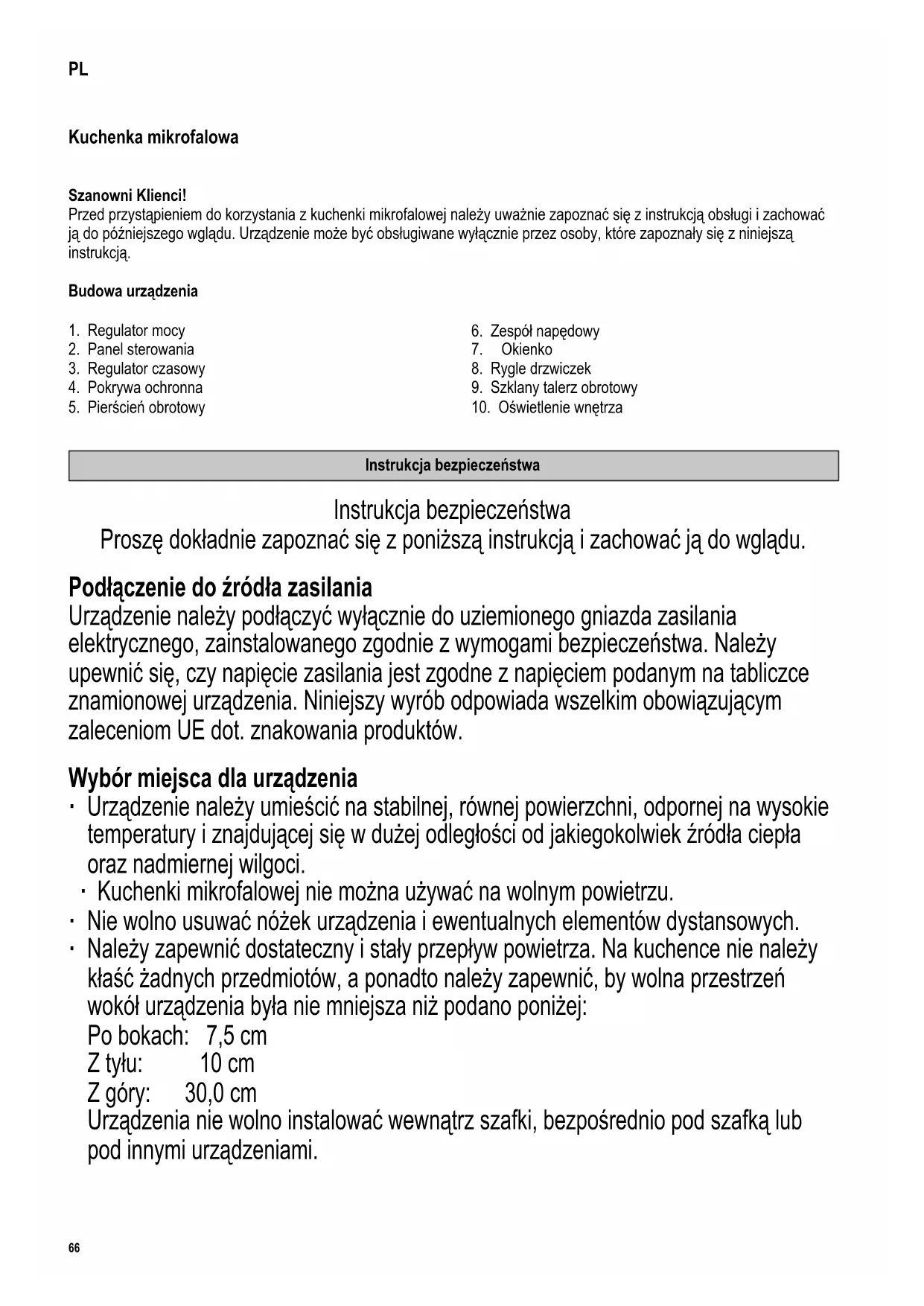 Instrukcja bezpieczeństwa Instrukcja bezpieczeństwa Proszę dokładnie zapoznać się z poniższą instrukcją i zachować ją do wglądu. Podłączenie do źródła zasilania Urządzenie należy podłączyć wyłącznie do uziemionego gniazda zasilania elektrycznego, zainstalowanego zgodnie z wymogami bezpieczeństwa. Należy upewnić się, czy napięcie zasilania jest zgodne z napięciem podanym na tabliczce znamionowej urządzenia. Niniejszy wyrób odpowiada wszelkim obowiązującym zaleceniom UE dot. znakowania produktów. Wybór miejsca dla urządzenia ∙ Urządzenie należy umieścić na stabilnej, równej powierzchni, odpornej na wysokie temperatury i znajdującej się w dużej odległości od jakiegokolwiek źródła ciepła oraz nadmiernej wilgoci. ∙ Kuchenki mikrofalowej nie można używać na wolnym powietrzu. ∙ Nie wolno usuwać nóżek urządzenia i ewentualnych elementów dystansowych. ∙ Należy zapewnić dostateczny i stały przepływ powietrza. Na kuchence nie należy kłaść żadnych przedmiotów, a ponadto należy zapewnić, by wolna przestrzeń wokół urządzenia była nie mniejsza niż podano poniżej: Po bokach: 7,5 cm Z tyłu: 10 cm Z góry: 30,0 cm Urządzenia nie wolno instalować wewnątrz szafki, bezpośrednio pod szafką lub pod innymi urządzeniami.67 142 x 208 mm Ważne wskazówki ∙ Ostrzeżenie: Niektóre rodzaje żywności mogą się łatwo zapalić. Nie pozostawiaj włączonego urządzenia bez nadzoru. ∙ Kuchenka mikrofalowa jest przeznaczona wyłącznie do rozmrażania, podgrzewania i gotowania potraw. Ostrzeżenie: Wszelkie próby suszenia żywności lub części garderoby, podgrzewania wkładek rozgrzewających, kapci, gąbek, mokrych ubrań itp. mogą doprowadzić do obrażeń ciała, spalenia lub pożaru. ∙ Producent nie ponosi odpowiedzialności za szkody wynikłe w skutek nieprawidłowego korzystania z urządzenia bądź nie stosowania się do niniejszej instrukcji. ∙ Można używać wyłącznie naczyń nadających się do mikrofalówki. Nie wolno używać metalowych pojemników w celu podgrzewania żywności i napojów w kuchence mikrofalowej. Więcej informacji na ten temat można znaleźć w punkcie pt. „Stosowanie odpowiednich naczyń kuchennych”. ∙ Urządzenie nie jest przystosowane do bycia uruchamianym przy użyciu zewnętrznego czasomierza lub odrębnego systemu zdalnego sterowania. ∙ Osoby o ograniczonych zdolnościach zycznych, czuciowych lub psychicznych albo nieposiadające stosownego doświadczenia lub wiedzy, a także dzieci (w wieku co najmniej 8 lat), mogą korzystać z urządzenia, pod warunkiem że znajdują się pod nadzorem lub zostały poinstruowane, jak używać urządzenia i są w pełni świadome wszelkich zagrożeń i wymaganych środków ostrożności. ∙ Nie dopuszczać do używania urządzenia jako zabawki przez dzieci. ∙ Nie wolno pozwalać dzieciom na wykonywanie jakichkolwiek prac związanych bezpośrednio z konserwacją lub czyszczeniem urządzenia bez nadzoru osoby dorosłej. ∙ Nie dopuszczać do urządzenia i jego przewodu zasilającego dzieci poniżej 8 lat. ∙ Zanurzanie urządzenia w wodzie i mycie go wodą jest niedozwolone i może grozić porażeniem prądem. ∙ Urządzenie nie może być czyszczone za pomocą myjki parowej. ∙ Urządzenie należy wyłączyć i wyjąć wtyczkę przewodu zasilającego z gniazdka elektrycznego: - przed przystąpieniem do czyszczenia lub mycia; - w przypadku stwierdzenia wadliwego działania; - po zakończeniu pracy. ∙ Wyjmując wtyczkę z gniazdka nigdy nie należy szarpać za przewód. Nie należy dotykać wtyczki mokrymi rękami.68 142 x 208 mm ∙ Ostrzeżenie: W czasie używania kuchenki, zewnętrzna obudowa urządzenia może się znacznie rozgrzać, a z otworów wentylacyjnych może wydobywać się gorąca para. Aby uniknąć oparzenia, należy w obu wypadkach przestrzegać zasad bezpieczeństwa. ∙ Nie wolno dopuścić, by urządzenie lub przewód zasilający dotykał rozgrzanych powierzchni lub znajdował się w bezpośrednim sąsiedztwie silnych źródeł ciepła. Przewód zasilający nie powinien swobodnie zwisać, ani też dotykać rozgrzanych elementów urządzenia. ∙ Nieutrzymywanie urządzenia w czystości może spowodować pogorszenie się jakości jego powierzchni, a następnie skrócenie okresu jego użytkowania, jak również zagrożenie dla bezpieczeństwa użytkownika. Dlatego wszelkie pozostawione resztki jedzenia należy od razu usuwać. Po każdym użyciu należy wyczyścić uszczelki drzwiczek, komorę kuchenki z podstawką obrotową i przyległe elementy wilgotną ściereczką. Ruszt do grillowania i podstawkę obrotową czyścić pod bieżącą wodą. Szczegółowe informacje na temat czyszczenia urządzenia znajdują się w punkcie Czyszczenie i konserwacja. ∙ Urządzenie przeznaczone jest do zastosowań domowych lub podobnych, jak np. w - kuchniach biurowych lub innych miejscach pracy; - agroturystyce; - przez klientów w hotelach, motelach i podobnych rodzajach środowisk mieszkalnych; - pensjonatach. ∙ Ostrzeżenie! Wszelkie reperacje kuchenki, które wymagają usunięcia pokryw chroniących przed promieniowaniem, są związane z dużym niebezpieczeństwem dla zdrowia i muszą być dokonywane przez odpowiednio wykwalikowany personel. W skład takich reperacji wchodzi wymiana specjalnego przewodu przyłączeniowego lub żarówki wewnątrz kuchenki. W przypadku niezbędnej naprawy prosimy o dostarczenie urządzenia do jednego z naszych punktów obsługi. Ich adresy podane są w karcie gwarancyjnej w języku polskim. ∙ Podczas podgrzewania płynów w kuchence mikrofalowej może się zdarzyć, iż płyn ulegnie zagotowaniu bez widocznych objawów wrzenia. Należy zatem zachować szczególną ostrożność w obchodzeniu się z pojemnikami, np. podczas wyjmowania ich z kuchenki. ∙ W kuchence mikrofalowej nie wolno podgrzewać jajek w skorupkach lub jajek ugotowanych na twardo, ponieważ mogą one eksplodować 