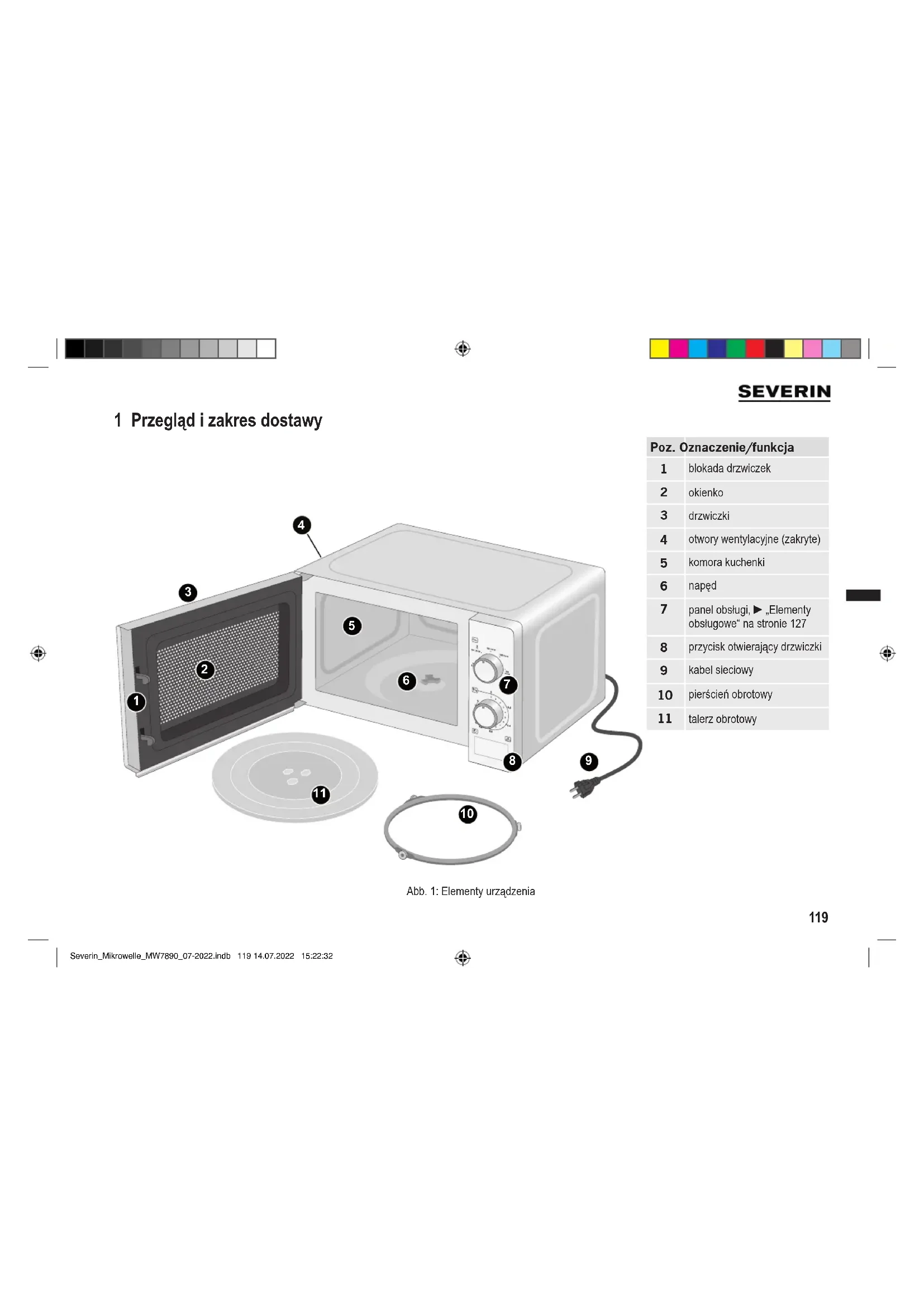 - talerz obrotowy Severin_Mikrowelle_MW7890_07-2022.indb 119 14.07.2022 15:22:32120 PL PL Droga Klientko! Drogi Kliencie! Życzymy wiele radości z produktu marki SEVERIN i dziękujemy za okazane nam zaufanie. Od ponad 120 lat marka SEVERIN oznacza trwałość, niemiecką jakość i potencjał rozwojowy. Każde urządzenie jest starannie produkowane i sprawdzane. Od założenia w 1892 roku to rodzinne przedsiębiorstwo z Sunden z przysło- wiową sauerlandzką sumiennością, dokładnością i rzetelnością przekonuje klientów na całym świecie swoimi innowacyjnymi projektami. Przedsiębiorstwo SEVERIN oferuje szeroki asortyment drobnego sprzętu AGD z ponad 250 rodzajami produktów, podzielonych na osiem grup: kawa, śniadanie, kuchnia, grillowanie, gospodarstwo domowe, pielęgnacja podłóg, pielęgnacja osobista oraz chłodzenie i zamrażanie. Właściwy produkt na każdą okazję! Zapraszamy do zapoznania się z różnorodnością naszych produktów na stronie www.severin.de lub www.severin.com. Zespół SEVERIN Spis treści 1 Przegląd i zakres dostawy p. 119
