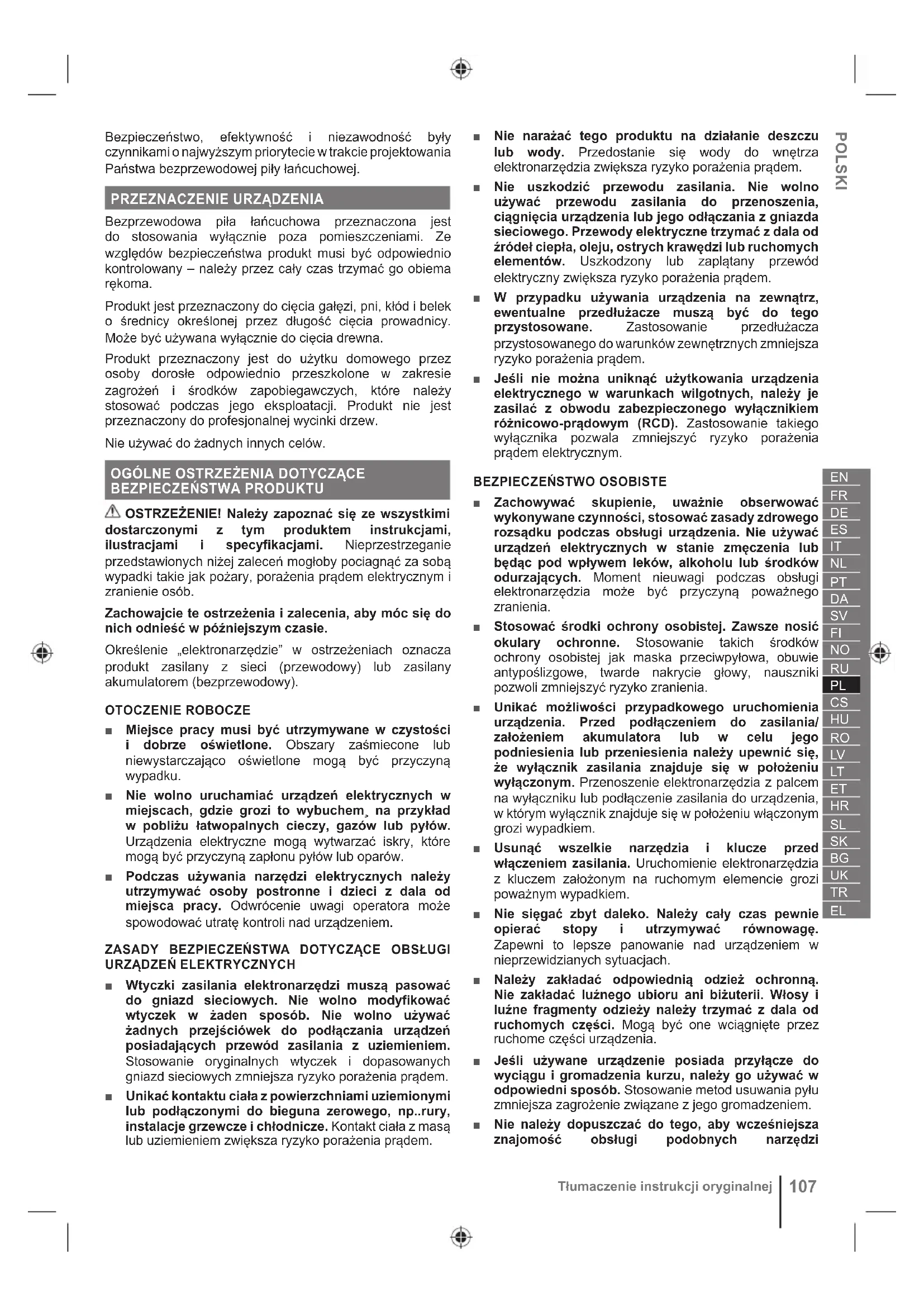 BEZPIECZEŃSTWA ■ Należy wziąć udział w profesjonalnie zorganizowanym kursie poświęconym eksploatacji i konserwacji pilarek łańcuchowych, działaniom zapobiegawczym oraz pierwszej pomocy. Niniejszą instrukcję należy przechowywać w bezpiecznym miejscu do późniejszego użytku. ■ Pilarki łańcuchowe są urządzeniami potencjalnie niebezpiecznymi. Wypadki związane z eksploatacją pilarek łańcuchowych często skutkują utratą kończyn lub śmiercią. Przyczyną śmierci mogą być także spadające gałęzie, przewracające się drzewa oraz staczające się kłody. Zaatakowane przez choroby lub zmurszałe drewno także stwarza dodatkowe zagrożenia. Zawsze należy oszacować możliwość bezpiecznego wykonania pracy. W przypadku jakichkolwiek wątpliwości należy zlecić wykonanie pracy profesjonalnemu arboryście. ■ Nie należy ciąć winorośli ani drobnej roślinności (o średnicy mniejszej niż 75 mm). ■ Zaleca się rozpoczęcie użytkowania produktu od przećwiczenia cięcia kłód na koźle do piłowania drewna lub kołysce. ■ Powierzchnia strefy roboczej zależy tak samo od rodzaju pracy do wykonania jak i od rozmiaru drzewa czy przedmiotu do obróbki. Np. ścięcie drzewa wymaga większego obszaru110 Tłumaczenie instrukcji oryginalnej pracy niż wykonywanie innych cięć, takich jak przerzynanie itp. Operator musi być świadomy oraz musi kontrolować wszystko, co dzieje się na obszarze pracy. ■ Nie wolno ciąć, znajdując się w jednej linii z prowadnicą i łańcuchem. W przypadku odbicia pozycja ta pomoże zapobiec zetknięciu się łańcucha z głową lub ciałem operatora. ■ W trakcie cięcia nie należy przemieszczać piły do tyłu i do przodu. Cięcie łańcuchem odbywa się samoczynnie, a interwencja operatora w tym zakresie jest niepożądana. Łańcuch powinien być ostry. Nie należy przepychać łańcucha w szczelinie. ■ W końcowym etapie cięcia nie należy wywierać nacisku na pilarkę. Należy przygotować się na utrzymanie ciężaru narzędzia, które wyjdzie z ciętego drewna. W przeciwnym razie istnieje niebezpieczeństwo doznania poważnych obrażeń ciała. ■ Nie należy zatrzymywać pilarki w trakcie cięcia. Pilarka powinna pracować przez cały czas aż do wyjścia z ciętego drewna. ■ Aby zmniejszyć ryzyko wypadku wynikające z zetknięcia z częściami w ruchu, zawsze wyłączyć produkt, załączyć hamulec łańcucha, wymontować akumulator i sprawdzić, czy wszystkie części ruchome całkowicie się zatrzymały: ● przed czyszczeniem lub usuwaniem zablokowanego materiału ● przed pozostawieniem produktu bez nadzoru ● przed montażem lub demontażem osprzętu ● przed sprawdzeniem, konserwacją lub obsługą produktu ■ Długotrwałe użytkowanie narzędzia może spowodować obrażenia ciała lub nasilić dolegliwości zdrowotne. W przypadku długotrwałego użytkowania jakiegokolwiek produktu należy robić regularne przerwy. ■ W przypadku upuszczenia produktu, narażenia jej na silne uderzenie lub w przypadku wystąpienia nietypowych wibracji należy natychmiast zatrzymać produkt i sprawdzić, czy nie ma oznak uszkodzenia lub ustalić przyczynę wibracji. Wszelkie uszkodzone części muszą być odpowiednio naprawione lub wymienione w autoryzowanym punkcie serwisowym. ■ Produkt należy stosować tylko w temperaturach od 0°C do 40°C. ■ Produkt należy przechowywać w miejscu, w którym temperatura otoczenia wynosi od 10°C do 50°C.