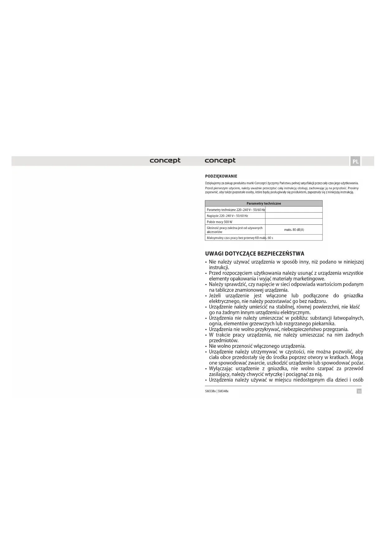 SM338x | SM348x PODZIĘKOWANIE Dziękujemy za zakup produktu marki Concept i życzymy Państwu pełnej satysfakcji przez cały czas jego użytkowania. Przed pierwszym użyciem, należy uważnie przeczytać całą instrukcję obsługi, zachowując ją na przyszłość. Prosimy zapewnić, aby także pozostałe osoby, które będą posługiwały się produktem, zapoznały się z niniejszą instrukcją. Parametry techniczne Parametry techniczne 220–240 V~ 50/60 Hz Napięcie 220–240 V~ 50/60 Hz Pobór mocy 500 W Głośność pracy zależna jest od używanych akcesoriów maks. 80 dB(A) Maksymalny czas pracy bez przerwy KB maks. 60 s