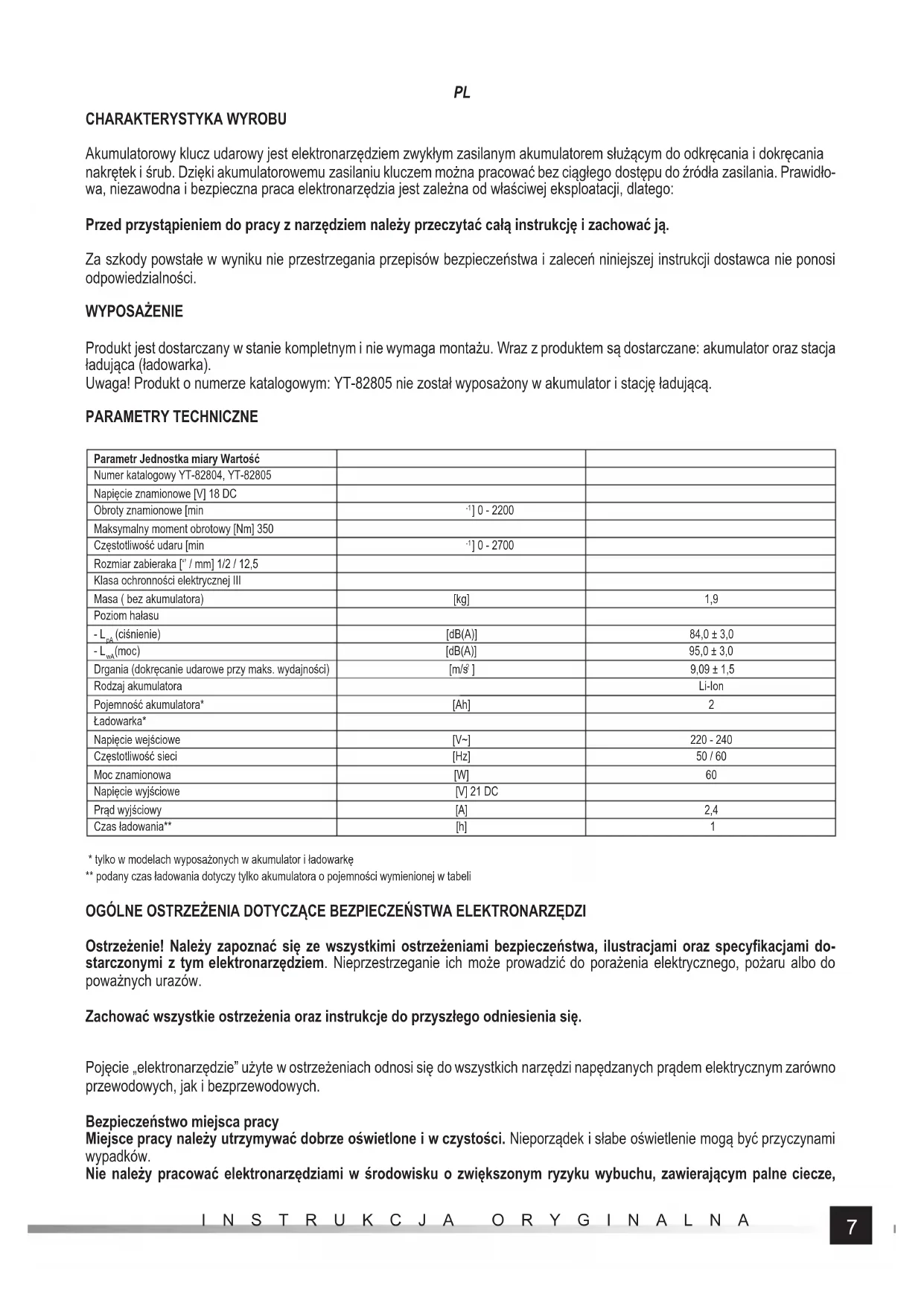 CHARAKTERYSTYKA WYROBU Akumulatorowy klucz udarowy jest elektronarzędziem zwykłym zasilanym akumulatorem służącym do odkręcania i dokręcania nakrętek i śrub. Dzięki akumulatorowemu zasilaniu kluczem można pracować bez ciągłego dostępu do źródła zasilania. Prawidło- wa, niezawodna i bezpieczna praca elektronarzędzia jest zależna od właściwej eksploatacji, dlatego: Przed przystąpieniem do pracy z narzędziem należy przeczytać całą instrukcję i zachować ją. Za szkody powstałe w wyniku nie przestrzegania przepisów bezpieczeństwa i zaleceń niniejszej instrukcji dostawca nie ponosi odpowiedzialności. WYPOSAŻENIE Produkt jest dostarczany w stanie kompletnym i nie wymaga montażu. Wraz z produktem są dostarczane: akumulator oraz stacja ładująca (ładowarka). Uwaga! Produkt o numerze katalogowym: YT-82805 nie został wyposażony w akumulator i stację ładującą. PARAMETRY TECHNICZNE Parametr Jednostka miary Wartość Numer katalogowy YT-82804, YT-82805 Napięcie znamionowe [V] 18 DC Obroty znamionowe [min