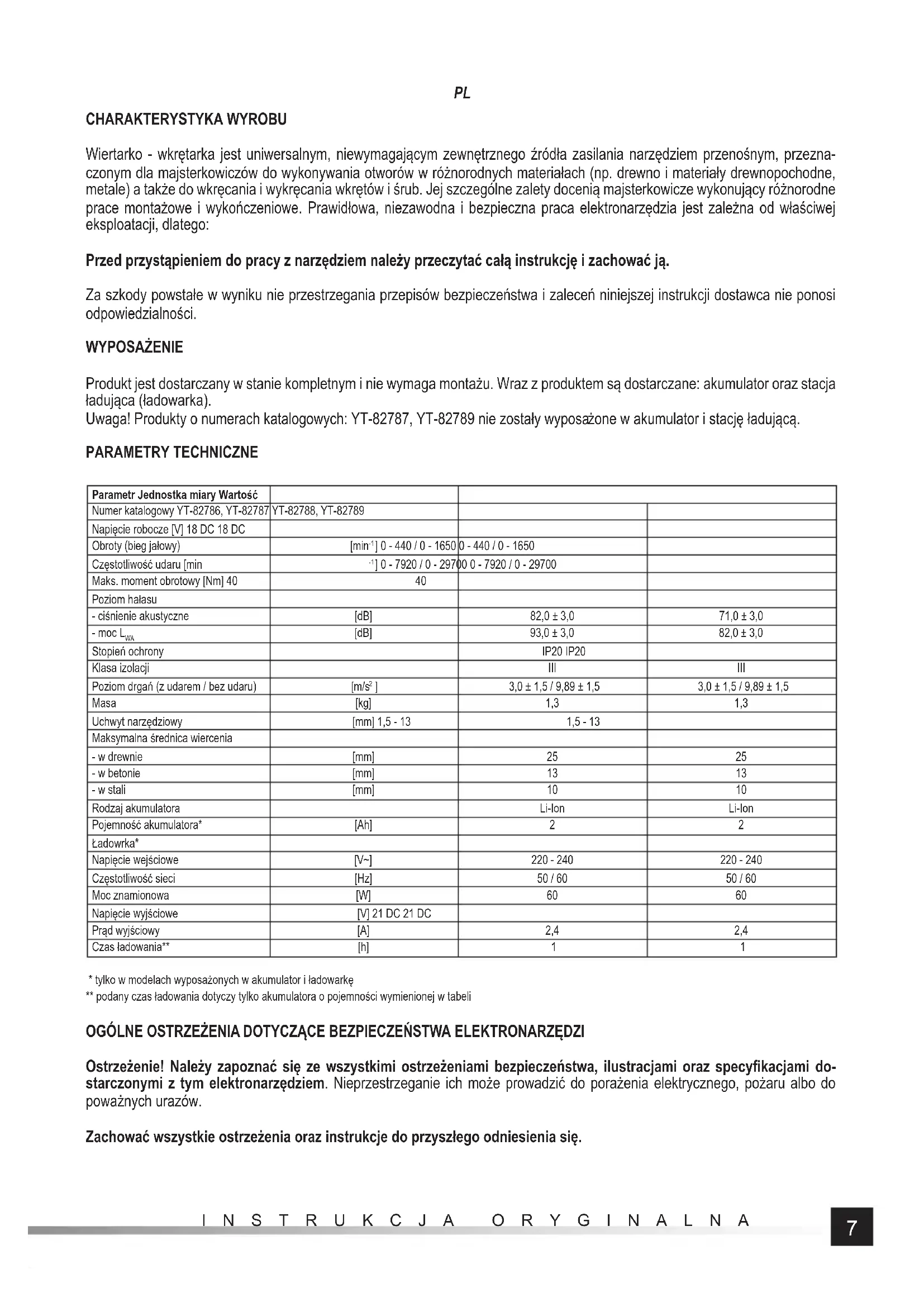 CHARAKTERYSTYKA WYROBU Wiertarko - wkrętarka jest uniwersalnym, niewymagającym zewnętrznego źródła zasilania narzędziem przenośnym, przezna- czonym dla majsterkowiczów do wykonywania otworów w różnorodnych materiałach (np. drewno i materiały drewnopochodne, metale) a także do wkręcania i wykręcania wkrętów i śrub. Jej szczególne zalety docenią majsterkowicze wykonujący różnorodne prace montażowe i wykończeniowe. Prawidłowa, niezawodna i bezpieczna praca elektronarzędzia jest zależna od właściwej eksploatacji, dlatego: Przed przystąpieniem do pracy z narzędziem należy przeczytać całą instrukcję i zachować ją. Za szkody powstałe w wyniku nie przestrzegania przepisów bezpieczeństwa i zaleceń niniejszej instrukcji dostawca nie ponosi odpowiedzialności. WYPOSAŻENIE Produkt jest dostarczany w stanie kompletnym i nie wymaga montażu. Wraz z produktem są dostarczane: akumulator oraz stacja ładująca (ładowarka). Uwaga! Produkty o numerach katalogowych: YT-82787, YT-82789 nie zostały wyposa żone w akumulator i stację ładującą. PARAMETRY TECHNICZNE Parametr Jednostka miary Wartość Numer katalogowy YT-82786, YT-82787 YT-82788, YT-82789 Napięcie robocze [V] 18 DC 18 DC Obroty (bieg jałowy) [min
